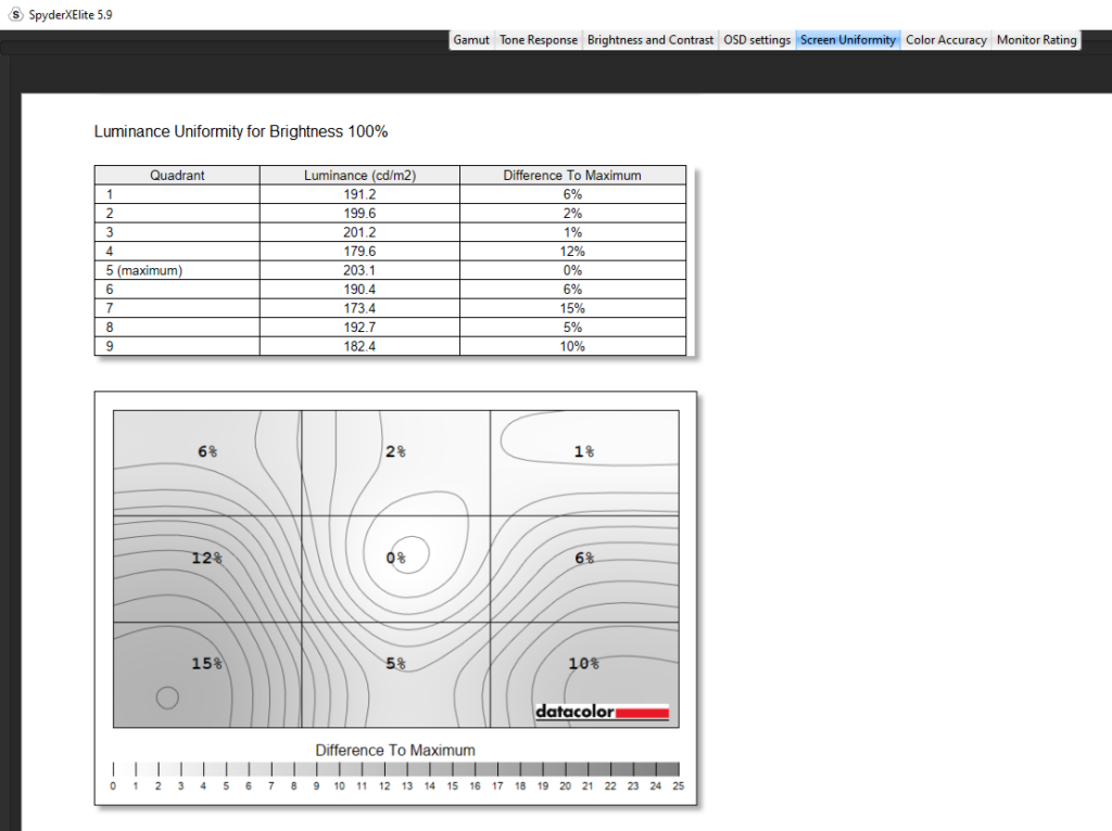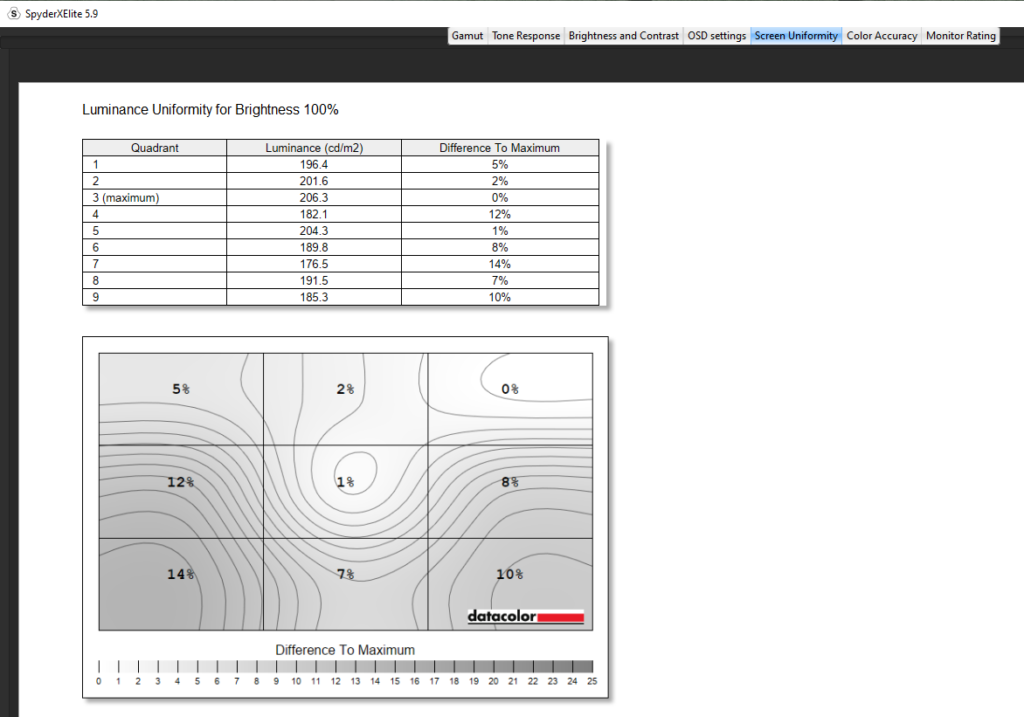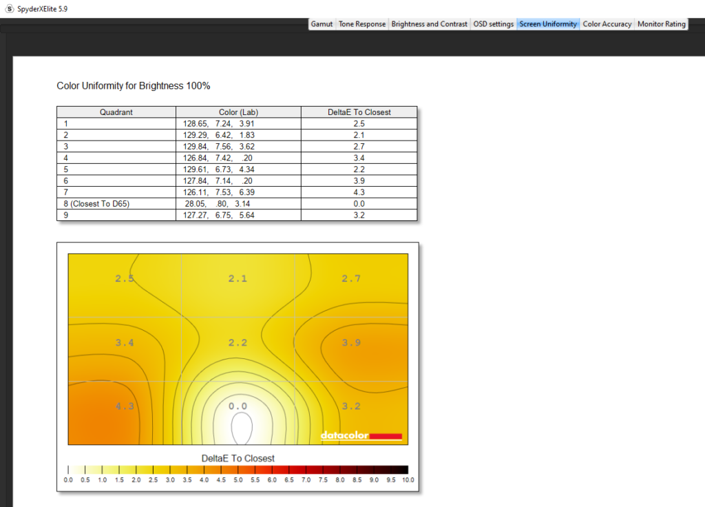 Running tests on the monitor, I found that my panel here was capable of 100% sRGB, 86% AdobeRGB and 95% P3 colour gamuts and to be fair to AOC with their contrast ratio claims, I found that 100% brightness or around 299 nits, it gave me a 1230:1 contrast ratio while 50% brightness or 165 nits had me closer to 1150:1 contrast ratio. Where I did find the monitor fell down a bit was with its colour uniformity, and at 100% brightness in the bottom left and bottom centre had issues with hot and cold spots, while the luminance uniformity, it was a bit sporadic over the entire panel, with the bottom left and left-hand side waving further from the path. Pre-calibration the colour accuracy wasn’t really too bad which I was shocked at, with an average Delta-E of 2.00, with the greys really falling down here, and post-calibration with my Datacolor Spyder Elite, the average Delta-E sat at 2.7. So out of the box, not really a bad monitor to be honest.