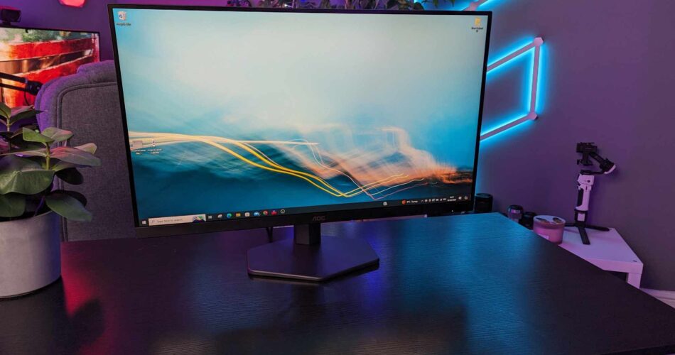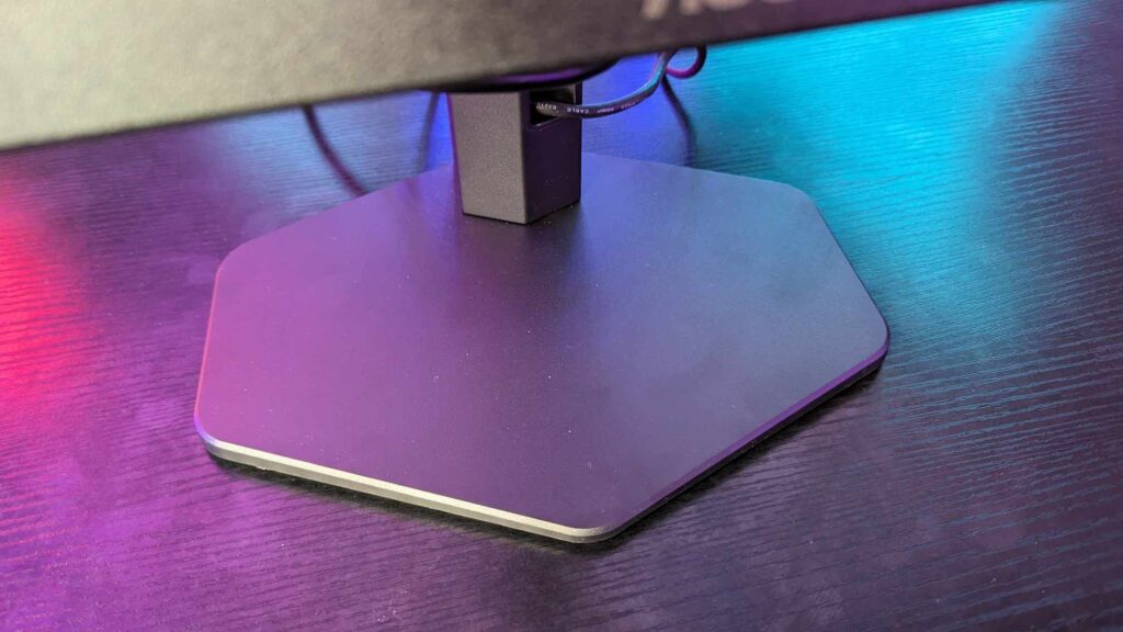 The monitor arm is chunky and features an off-centre cable management hole which looks a bit strange. Why the squared-off monitor arm isn’t centred is a bit of an odd design choice by AOC, because it’s not like the cable management hole goes from front to back. It kind of goes from side to side, which doesn’t really hide any cables. The arm though is capable of height adjustment, tilt, swivel and rotate if you’re after a vertical aspect ratio on your monitor which makes it a flexible choice for those with a multi-monitor setup. Around the back, you’ve got two HDMI 2.0 ports with HDCP 2.2. There’s one DisplayPort 1.4 which I used for my testing with a 4070Ti and finally, you’ve got an aux input for audio. It’s a very simple setup here. There’s no USB hub which I can honestly take of leave at this point. I don’t ever use them. And because it’s got that HDMI 2.0 input, you’ll be safe to use this with a games console too and get your 120Hz refresh rates at 1920×1080.