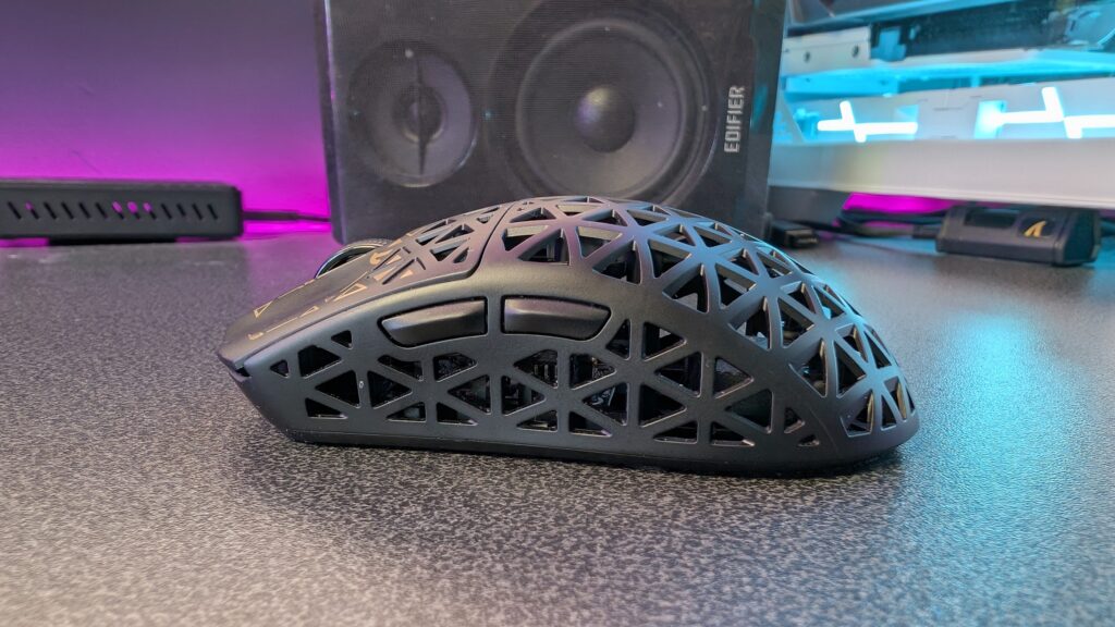 The Attack Shark R5 Ultra is a hollowed-out triangle patterned gaming mouse that comes in both black and white variants, and although I have the black one here and yes, it does look cool, with its gold accented Aztec-like pattern, the white one does look nicer. The hollowed out design helps keep the R5 Ultra’s weight off, but it’s really the injection moulded carbon fibre material this mouse is made from which really makes this thing shine when it comes to its weight, and yes you can chuck this thing around. It won’t break. Well, don’t stamp on it but you know what I mean. However, one thing I am not quite keen on when it comes to the triangle pattern is the way it feels on the right-hand side of the mouse where my right ring finger and little finger sits. For longer gaming sessions, it can begin to feel a little uncomfortable. You do get some grip tape in the box, and I do recommend using that, not that I have on mine here but I wanted to get some nice b-roll of all sides of the mouse.