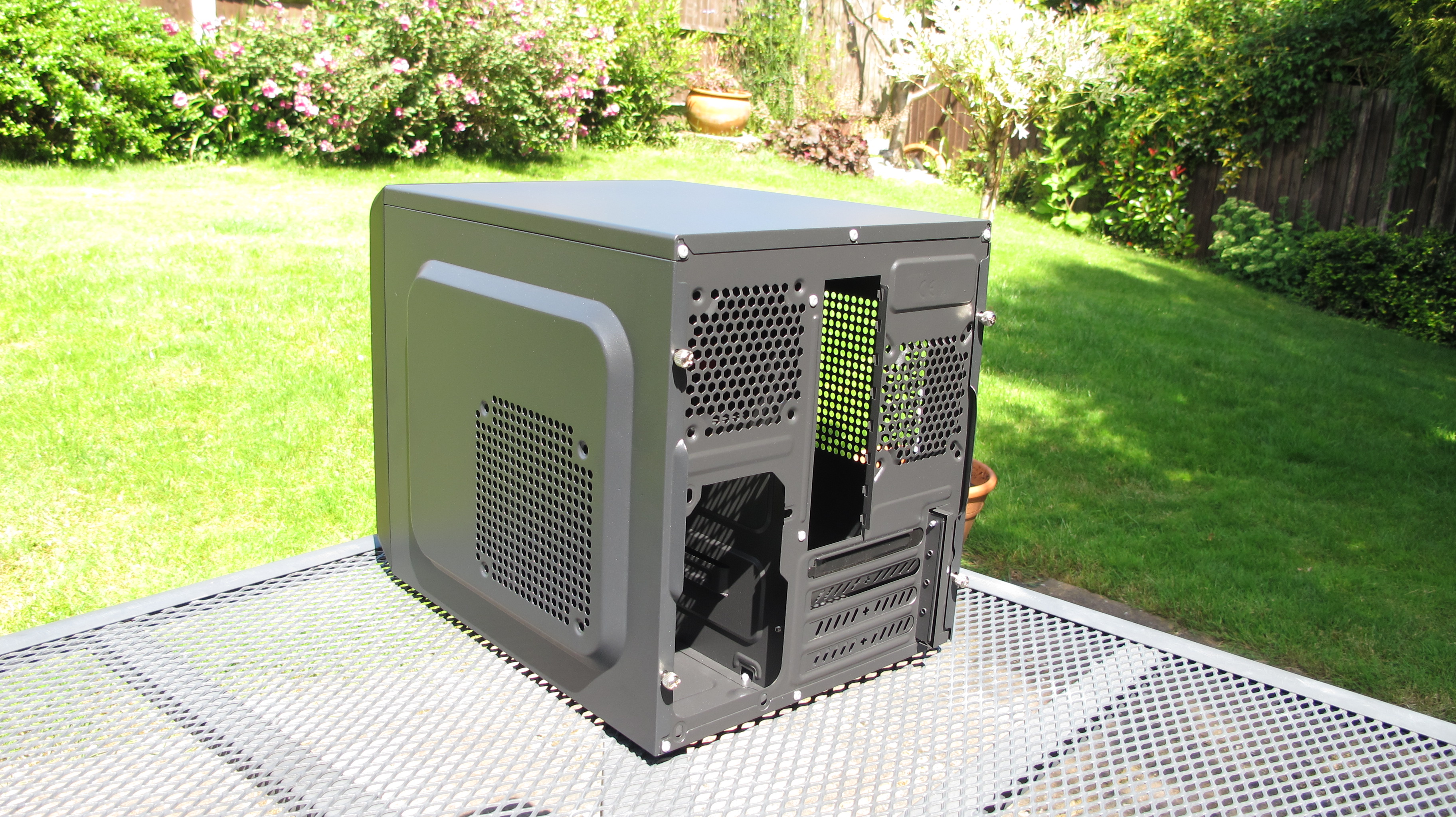 Anyway, with the wires all in the ‘back’ enclosure, just the motherboard sits up ‘front’, and that is where the crying shame is. Without a window, you can gaze lovingly upon all that non-wiryness especially as the whole thing inside is painted black. Lots of cut-outs to feed cables through and no sharp edges. Perhaps AvP can include one in their next version of this stylish cube design – or just leave the side off. Not really.