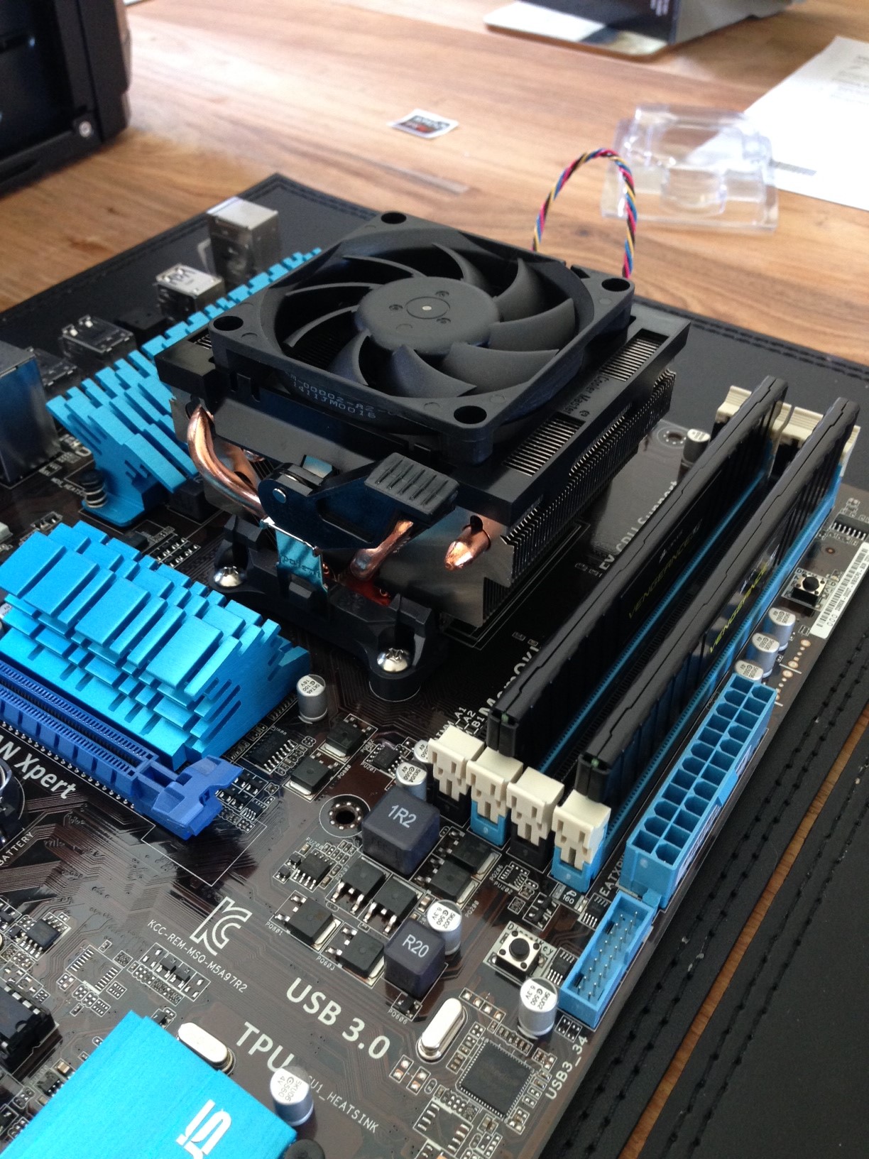 The first stage of the build was to set up the motherboard. This consisted of installing the CPU, cooler and RAM to start with. The CPU easily slots into the board’s designated slot, ensuring the arrow on the CPU and the arrow on the board match up. The CPU cooler was then installed on top, thermal paste was pre-applied to the cooler. If it wasn’t, I would have had to apply the paste myself. Then the ram simply slots into the slots and clipped into place.