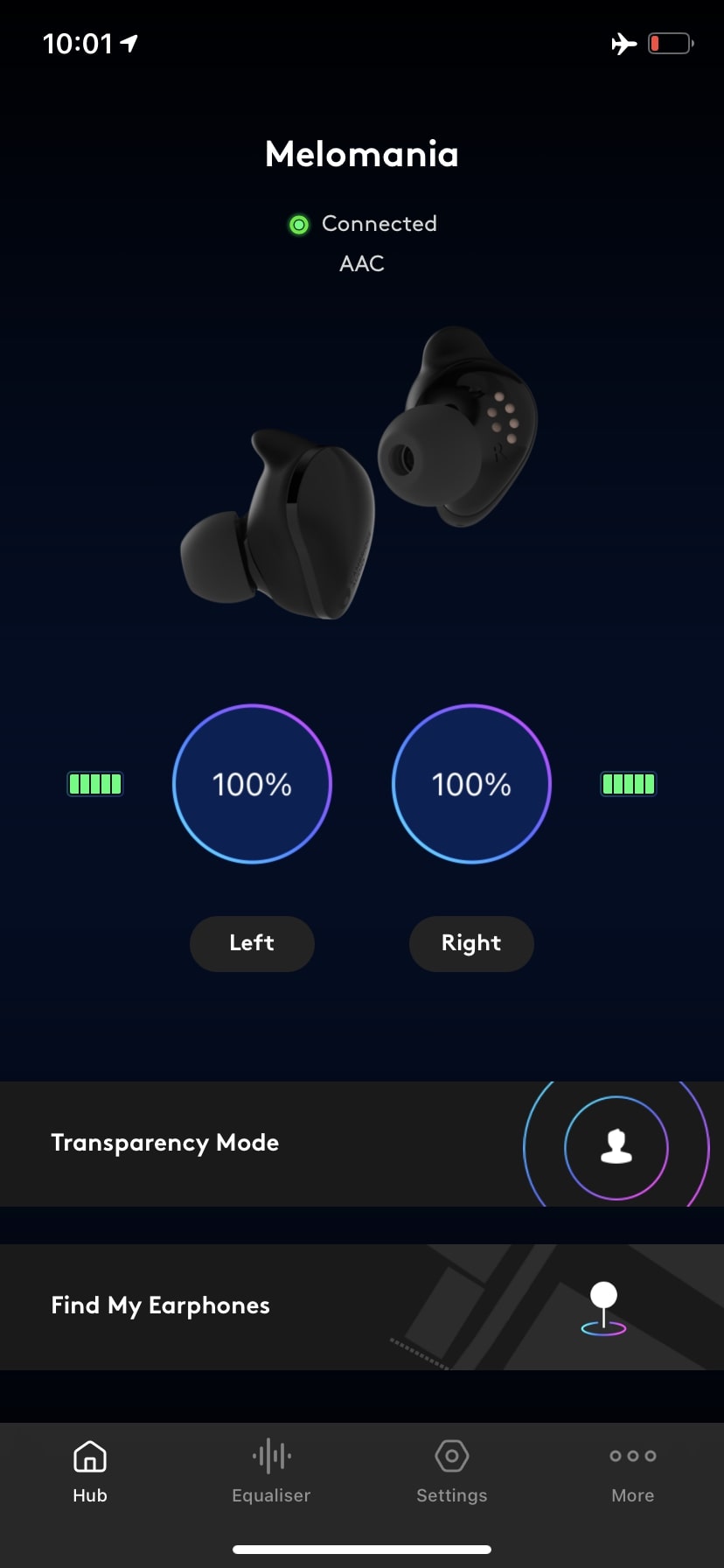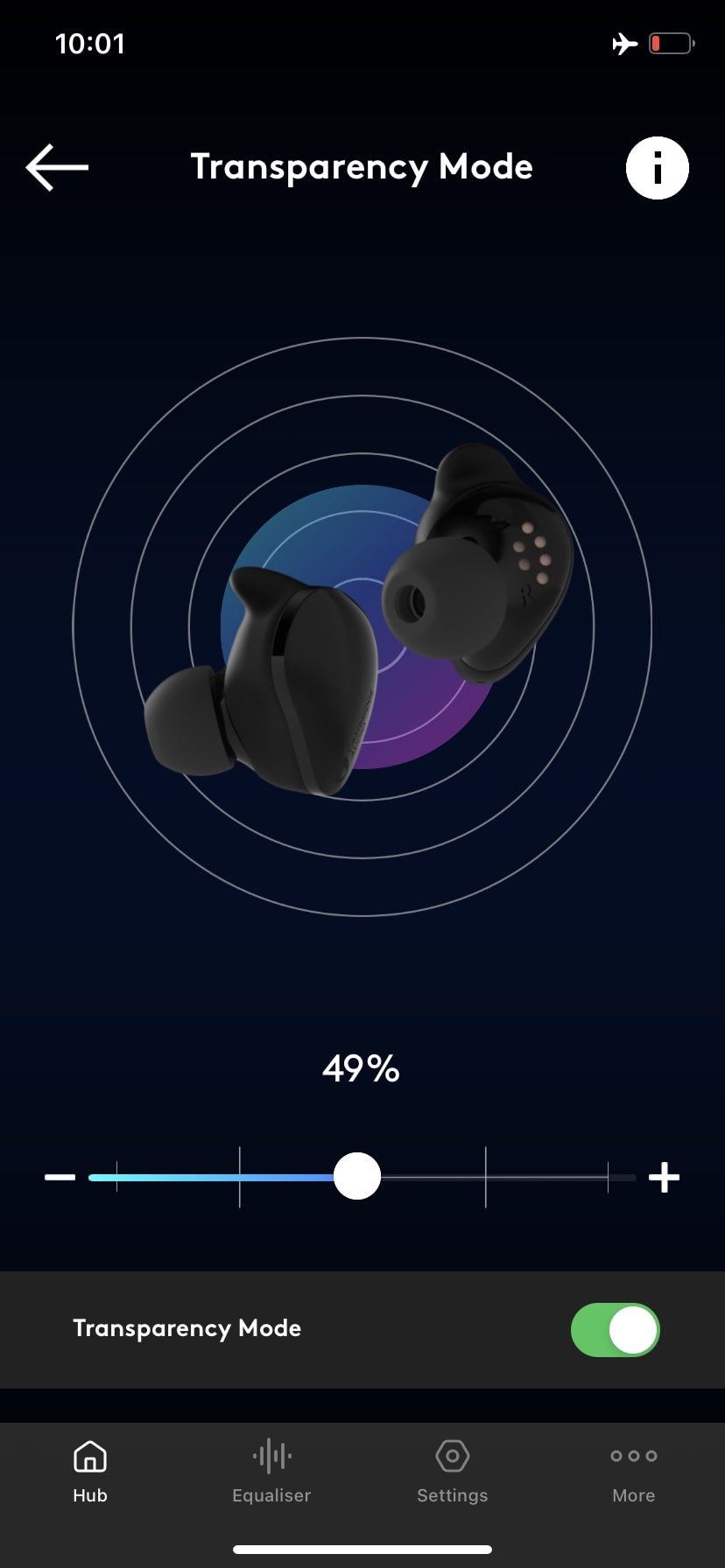 That being said, I found the app performance to be very good and have yet to come across any bugs or issues. Open the app up and on the home screen, it shows your earbud connection and the battery life for each earbud. Yes, one battery level for left, one for right, and what was fascinating, was the left’s battery level went down quicker than the right. Also on the home screen, you can activate the transparency mode and also ‘find my earphones’. Transparency mode is a simple on/off and then you can slide between 0 and 100%, depending on how much external audio you want to allow in.