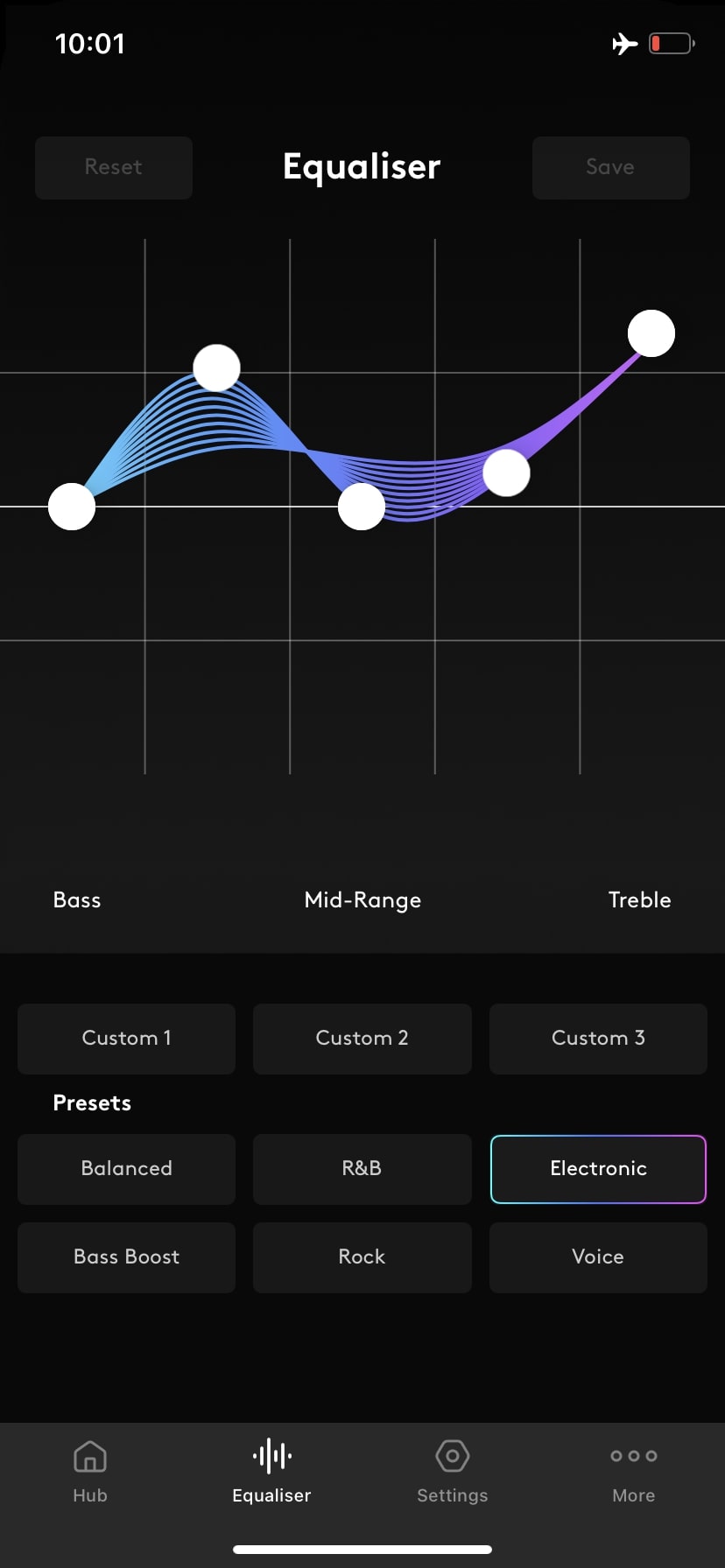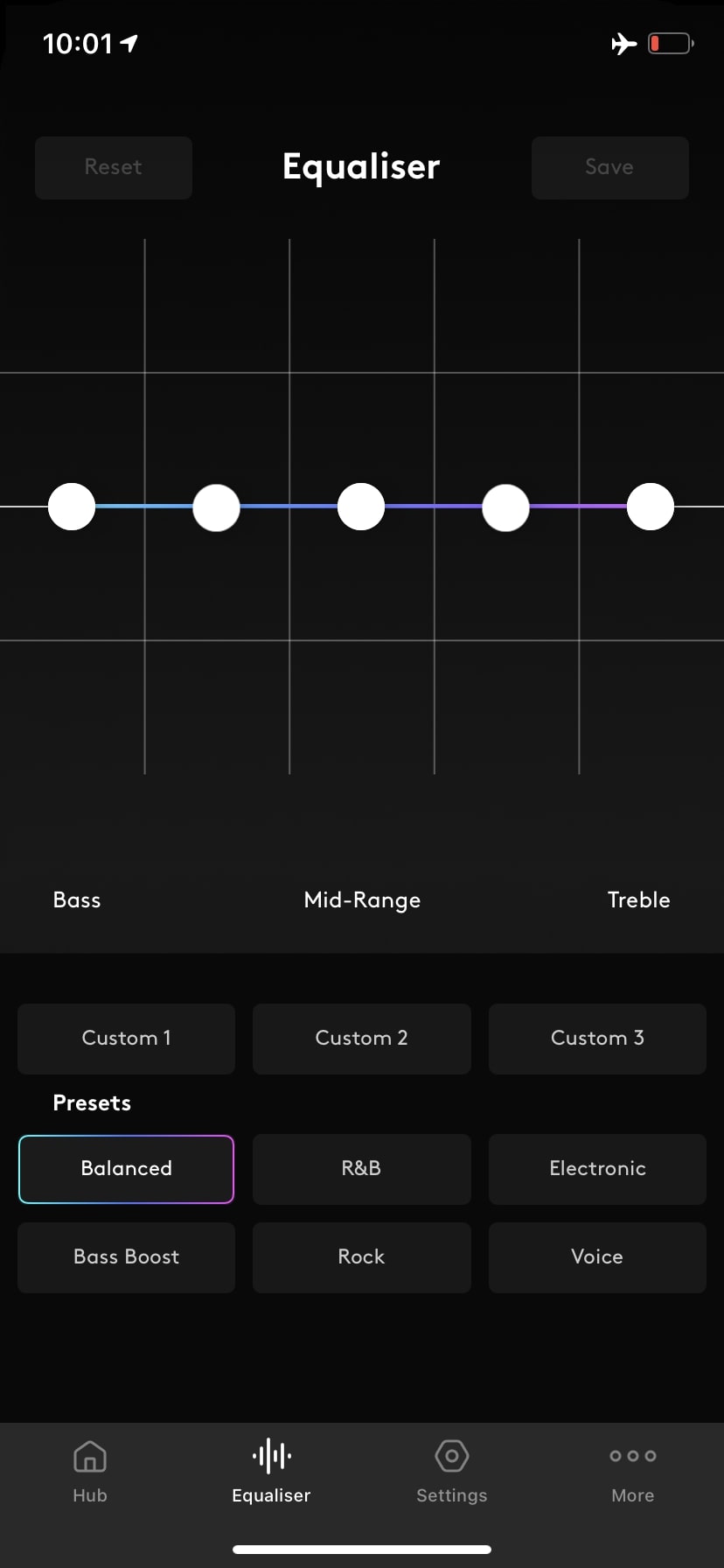 The app includes an equalizer for the earbuds and it’s great. There are six presets and three custom profiles, which you can edit and save. Clicking between the six presets, the profile change is instant in the earbuds, allowing you to very quickly understand which preset is best for which song. Above the presets are five white dots, which symbolise the EQ options between bass, mid and treble. Slide them up and down to build your own sound profile and save it out. Again, sliding up and down, the change is instant in the earbuds, no need to save and wait for them to transfer or update. It’s all very efficient and I love it.