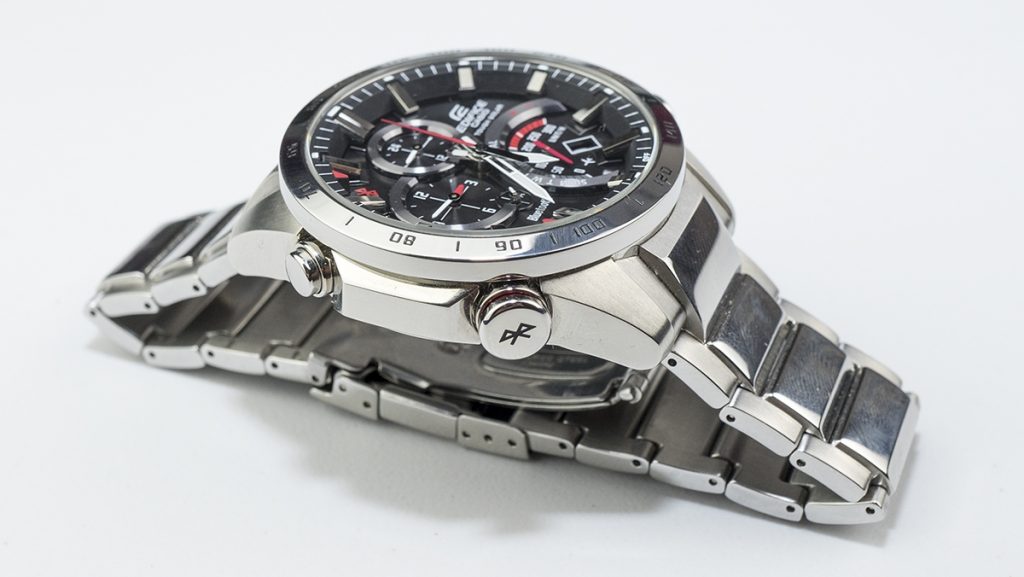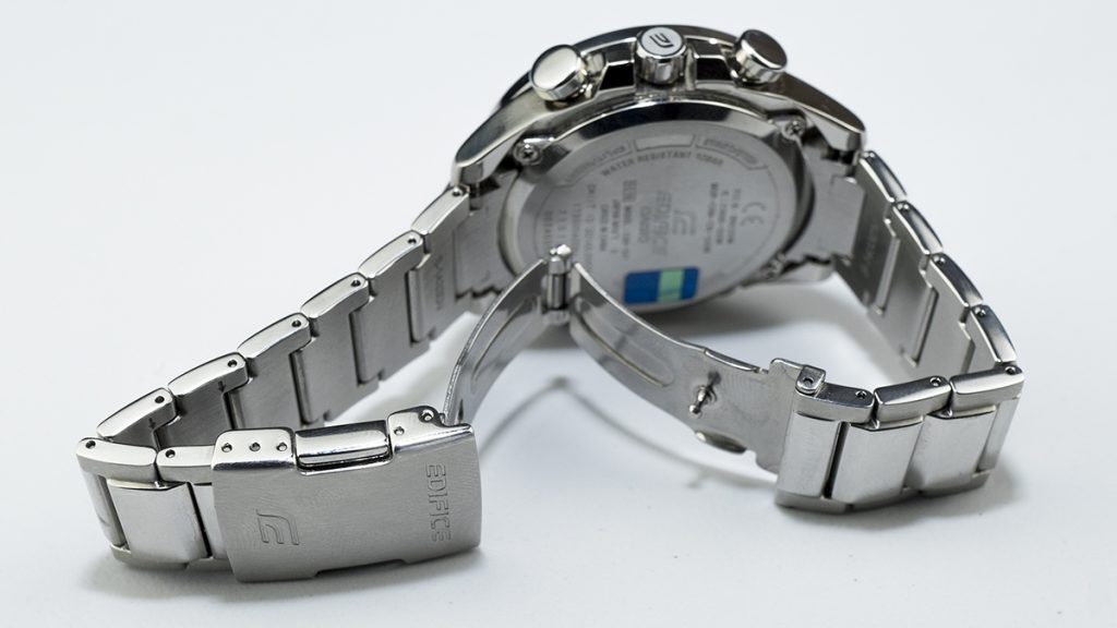 The watch uses a clamp system to attach it to your wrist which again feels solid. You pinch the clamp on either side to release it from your arm. The actual clamp has been branded with the Edifice logo. To be honest, there’s not much here letting any onlookers know that you are sporting a Casio. The only logo on the watch face is tiny.