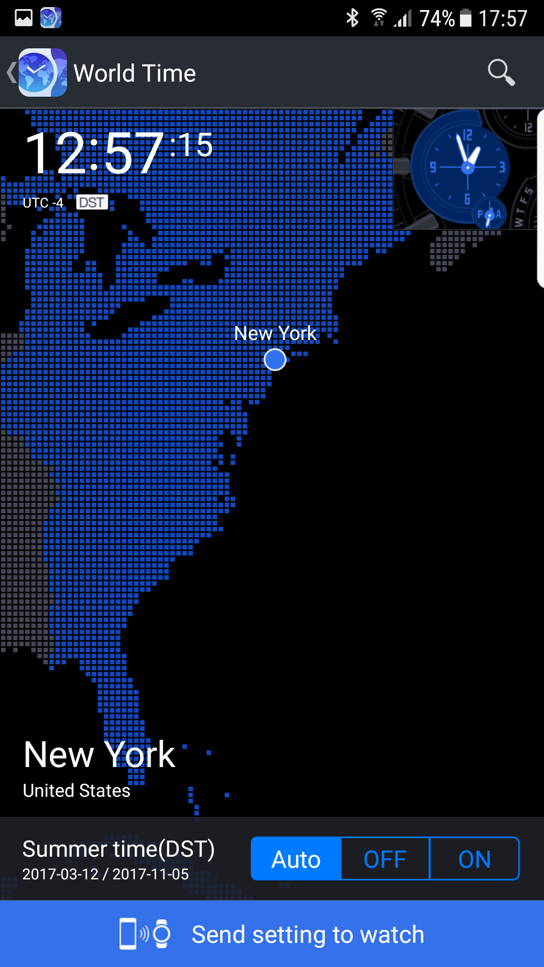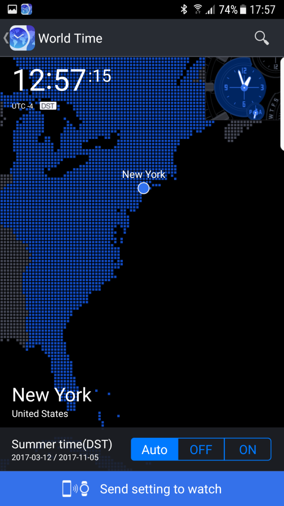 The second at 9 o clock represents the time in another city in the world. Inside the app you can choose from a drop down list which city you want to display. I chose New York because why not? New York is awesome. The third at the top gives you a 24-hour dial and the remaining bottom right dial gives you a day count. All dials are controlled within the app which I will speak about in a moment.