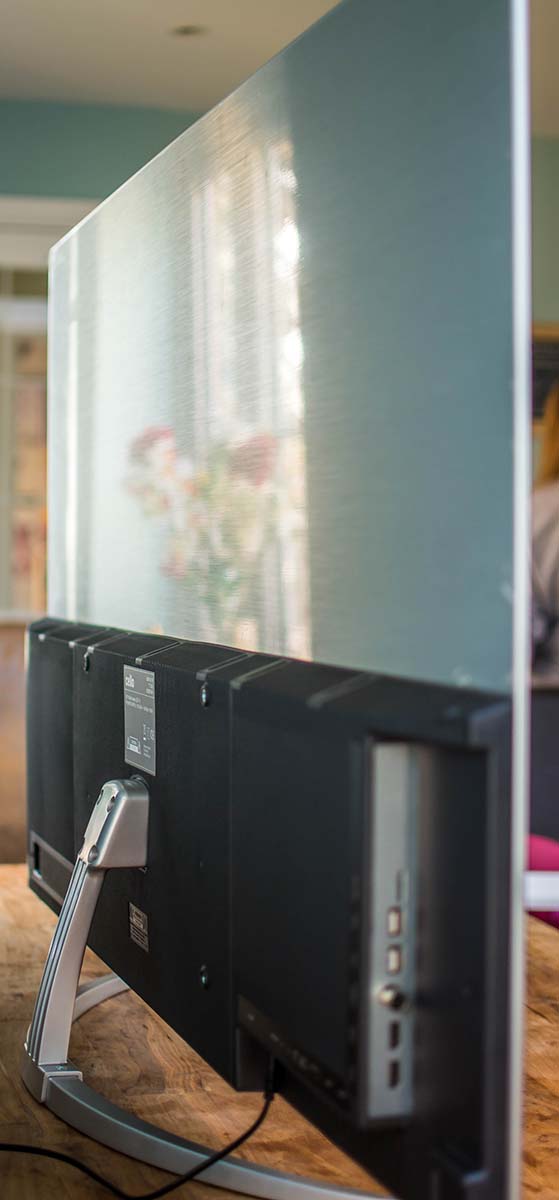 The overall build quality of the TV is very good. It has a thin silver frame and stand, with an even thinner silver bezel but that’s a smart design feature. The bezel is, in fact, black and silver, but the black blends in so well with the screen, you don’t notice until it’s turned on.  The panel itself is incredibly thin, millimetre thin, to 60% of it, and then the rest is built out to hold the TV components, stand and mounting options. Being so thin, extra care is needed when setting up.