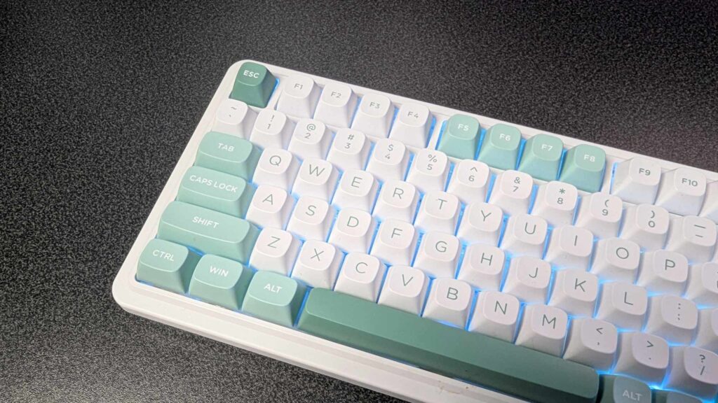 The Red Dragon Galatin is a lightweight 95-key wireless keyboard with an off-white and green colourway, with a few keys in a darker green. It very much embraces the fact it uses Linear Mint Mambo Switches, which before this keyboard, I’ve not had any experience with, but feel durable enough. They have an actuation travel of 2.0+5mm and 3.6mm total travel, and with a light 40+10 gram force, they make for a pretty light typing and gaming experience. I couldn’t really fault the feeling, though I must say they felt a bit light to the touch, like there’s no real resistance or a feeling of force on its return actuation. This might be due to the lightweightness of the keyboard itself, being made from ABS plastic and is gasket mounted, though this isn’t necessarily a bad thing either as the keyboard felt sturdy enough, though you do experience some what of a flex when pressing down on the keyboard, especially towards the centre of the board. You’ve also got rounded PBT keycaps, which feel nice and grippy, and they have a nice font which is clear and easy to read even on the coloured keys, though there’s no shine through, which I thought was a little disappointing.