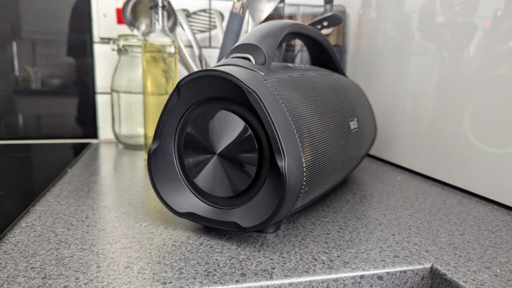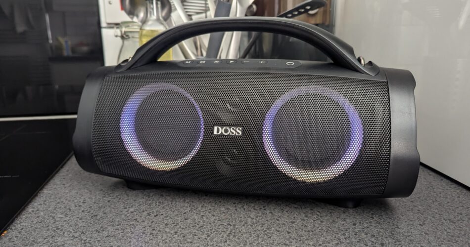 So when I was asked if I wanted to check ou the Doss Extreme Boom Pro speaker, I wasn’t quite expecting this. To be honest with you, on the channel, we’ve not really looked at much this size, and most Bluetooth speakers we see are usually the small portable kind that would sit nicely around the pool or in the park during a picnic. But this speaker is like party central, with big flashy LED lights around the drivers and a carry handle and even shoulder strap. It’s loud, and really I think in a good way.