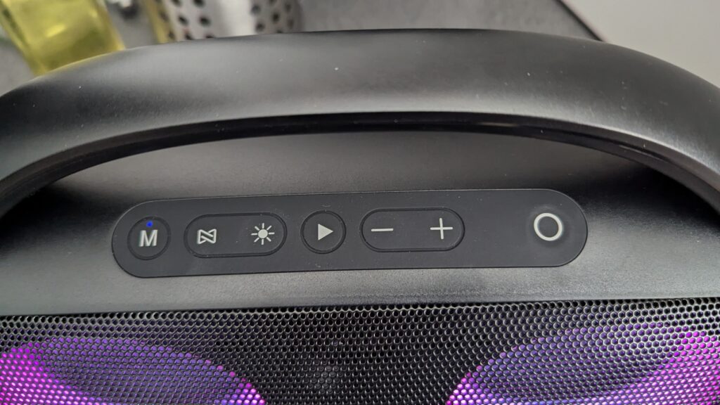 Let’s flip it back round to the front because I must say, it’s got quite a modern boom box-esque look to it. On top is a carry handle, admittedly made from plastic but solid enough. There’s a front metal grill with a small Doss badge on there, which to be honest with you looks very similar to the INEOS logo. You’ve got several rubber tactile buttons across the top just underneath the handle which are clear and feel nice and need a bit of effort to press. These buttons from left to right are for Mode where single presses cycle through each input and a hold turns on Extra Bass. There’s a button to connect two of these things together. Imagine the volume of that! You’ve got a light cycle button to run through the various patterns, including some sounds reaction patterns like an equaliser wave. The next is for play and pause and volume, and finally the power button on the right. I could not see skip track buttons and that’s a bit of a shame. I tried both holding and single-pressing the volume buttons to do it but no use.