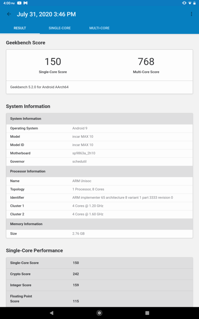 On Geekbench 5.2, we achieved a score of 150 on single-core, 768 on multi-core, which is comparable to something like the Samsung Galaxy Tab Pro 8.4 @ single-core, which is really old tech now. For reference, the new OnePlus8 achieves a single-core score of 904! We also tried the Max 10 with the Sling Shot benchmark by 3D Mark and it achieved an overall score of 530. Watching it benchmark was quite painful, the FPS was in single figures and it didn’t handle it very well at all. For reference, the iPhone 11 achieved something in the region of 7000 points.