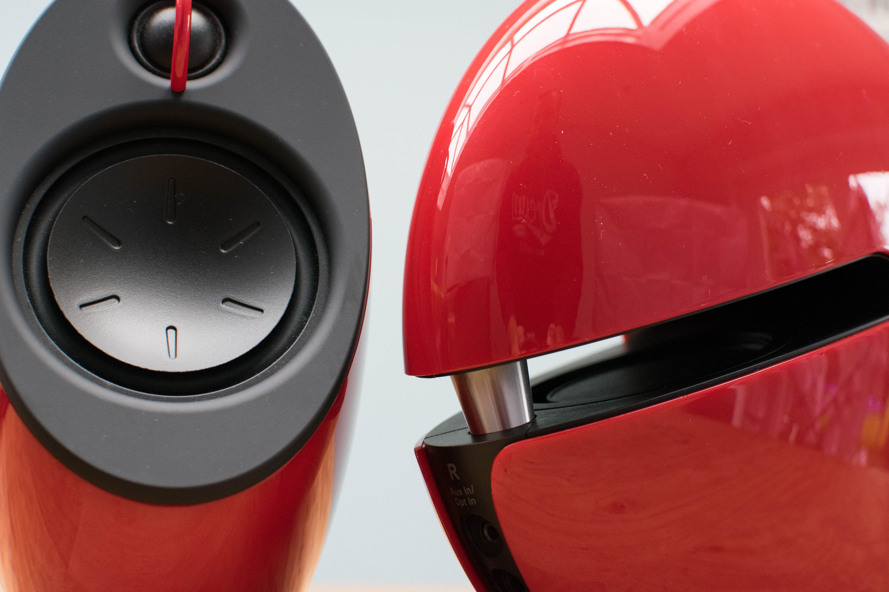 Before I even get into the box, I’m so excited to try these out, they look ultra modern and I love it. I grab my knife, make a small incision along the tape, the box opens and all I can see it red. Usually you would associate seeing red with something bad but not in this instance. Pulling the speakers out, I can feel they are heavy and have a good weight to them. I’m worried about finger marks on the glossy red finish but I have to have a feel, a look round.  There are 3″ bass/mid range drivers, plus a 3/4″ silk dome tweeter in each speaker. The bass drivers are hidden within the back of the speaker, which can only be seen at certain angles and the tweeter is protected with a glossy red plastic arch. Perfection!