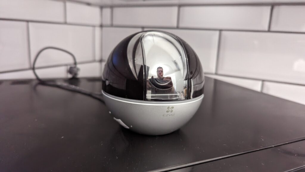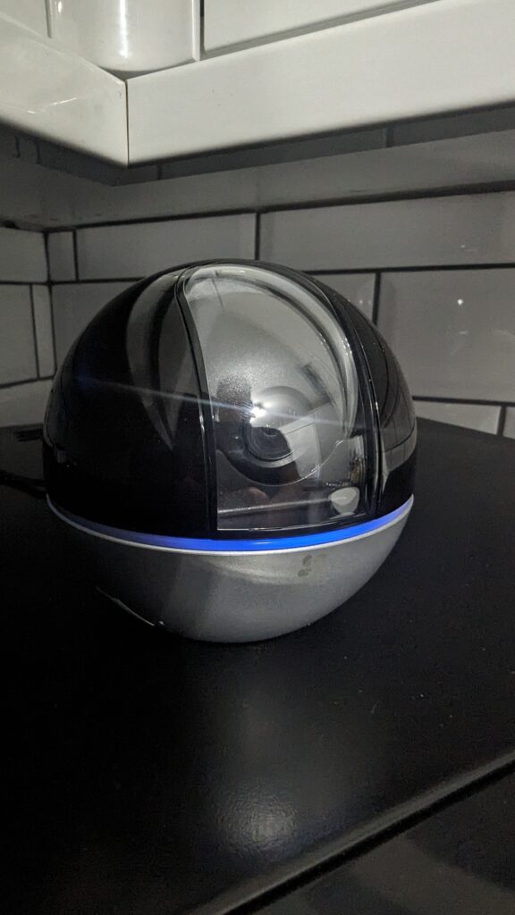 The EZVIZ E6 camera is small in size sitting at around 95 × 95 × 90 mm, and is covered in half black gloss plastic for the top half, and matte grey plastic for the bottom half. It’s extremely lightweight too at 252 grams which makes it easy for those ceiling mounting the device. The camera is called a pan/tilt camera, which means it can rotate a full 360 degrees in a circle and can look up. However, the camera is unable to look down past the horizon line. This makes putting the camera on a shelf somewhat problematic as if you’re going to be using it to watch your pets while you’re away, it cannot look at the floor. I’ve got mine on a microwave right now on a kitchen counter, and I can’t see the floor of my kitchen. So if you have a small dog or cat running around, you’re not going to be able to see them.