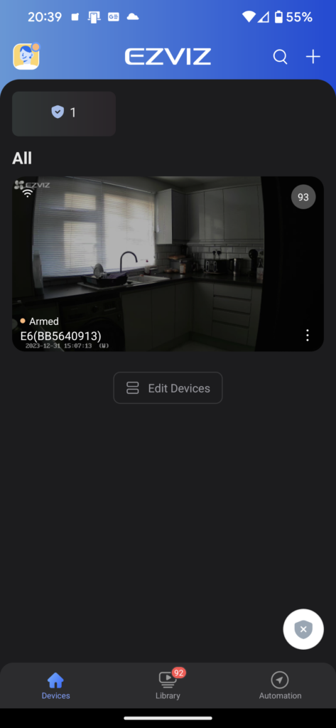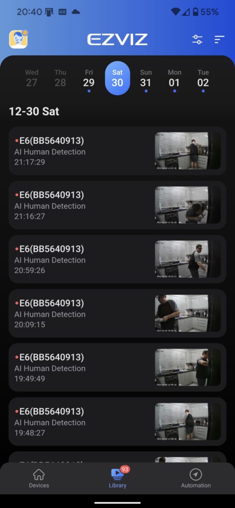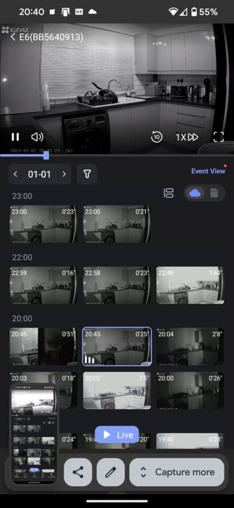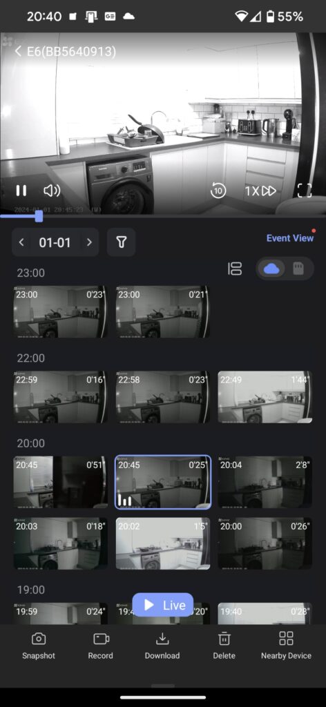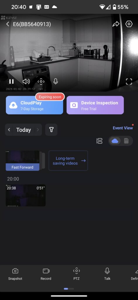 Once you’re fully set up though, everything is very nicely laid out in the EZVIZ app. The home screen is there to select each individual camera you have within the EZVIZ family, and if you click on each one it’ll take you to that individual camera and give you all the settings you need, right in front of you. A preview of what the camera sees is at the top, and underneath this is where clips are saved that your camera records. Under here are several tabs and buttons for taking snapshots, and recordings, manually panning the camera, talking through it as it’s got a microphone at the other end, and resolution changes. There’s a privacy mode if you need to cut the feed to the camera and you can even do picture-in-picture too if you have other cameras available.