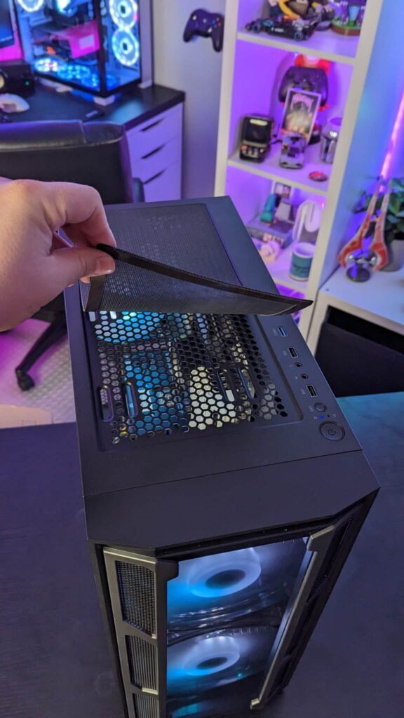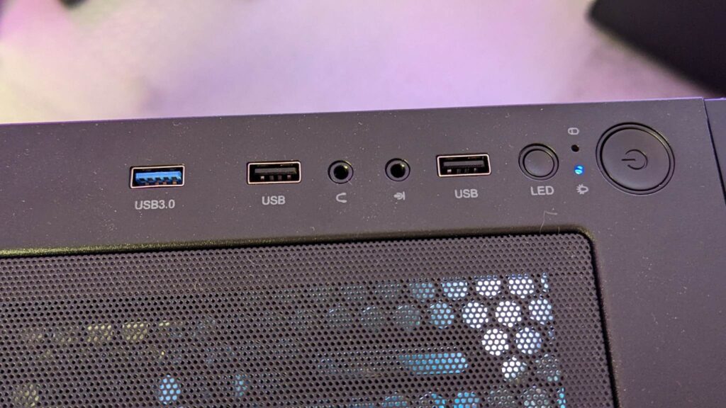 The reset button is wired into the hub so you can change the lighting mode by cycling through them all with the push of a button. On the front, there are the usual suspects of the power button, two USB2 and one USB3 slots along with HD audio and LED indicator. So, back to those fans and cooling in general.  At the front, it comes with two 200mm ARGB fans but you could swap them for two 140s or three 120s and at the rear, there is one 120mm ARGB fan.  There is room for two LED strips as well if that’s your thing. But of course, there is space up top for a wide range of radiators – at the front, there is room for up to a 360mm, on the top a 240, a 120 at the rear, and two 120mm fans on the bottom. Should be enough for anyone.