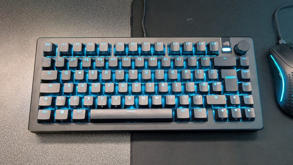 The Glorious GMMK 3 Pro uses Linear Mechanical switches which are completely hotswappable. The typing experience isn’t too bad, but they are quite clacky in my opinion. Take a quick listen now. They aren’t unfortunately Hall Effect either, so we’ve got basic mechanical switches here, though there is a HE version of this keyboard if you’re interested in that. Just don’t get banned from Counterstrike 2. The keyboard here is a 75% layout and I’ve got a few function keys down the right-hand side and a volume knob in the top right though this can be customised in the software to do more than just volume but more on that in a moment.