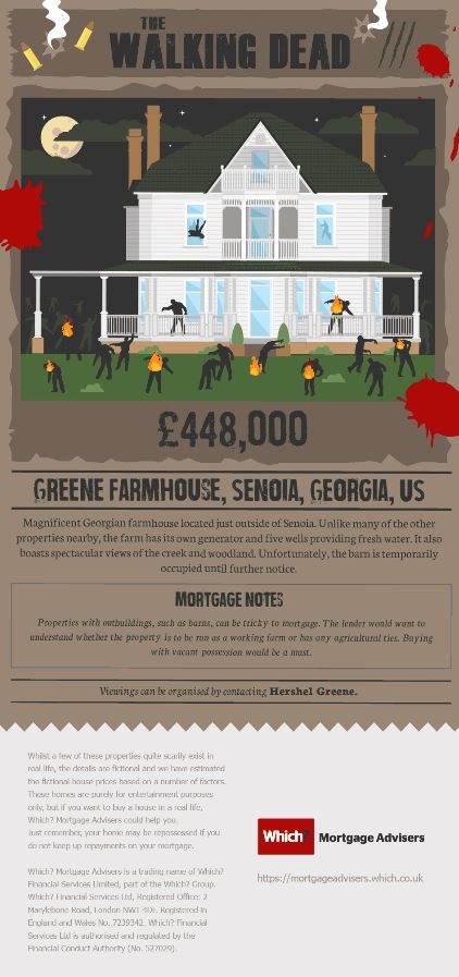 Fight along side Hershel’s family in this luxury £440,000 farmhouse. Yes, you will have to make do with constant bombardment from zombies, but a few boards on the windows should deal with that. Although the constant droney moans will keep you up at night. A 10% deposit would cost you roughly £44,800. It comes with outhouses and barns, and depending on the lender, would need to know if the house would be run as a working farm. But in this case, I don’t think zombie hoards could count as livestock somehow.