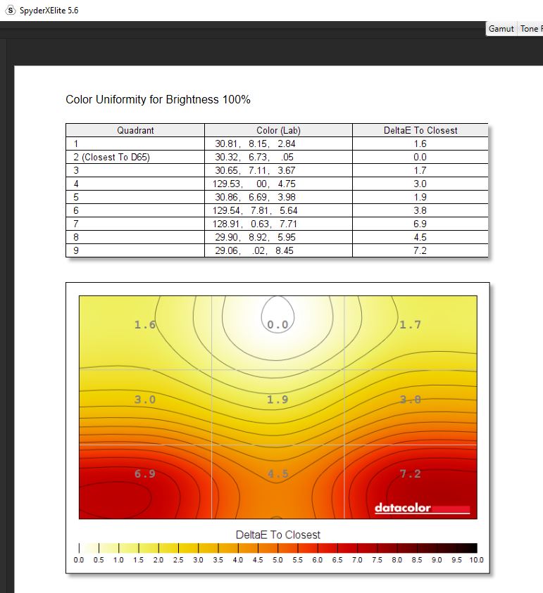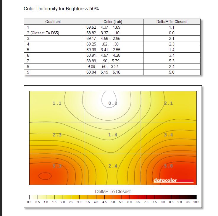 Where it did fall down though is with colour uniformity, where you can see at 100% brightness, dark spots appeared in the lower corners, and a hot spot at the top in the middle, but lowering the overall screen brightness did help with this, but it still tracked. However, saying all of this, in reality, I never noticed or had any complaints with it while gaming or watching media, so while these measurements are what my Datacolor SpyderX produced, it didn’t affect my day to day use of this monitor I was still very impressed with its performance. If you want more information, check out the gallery below.