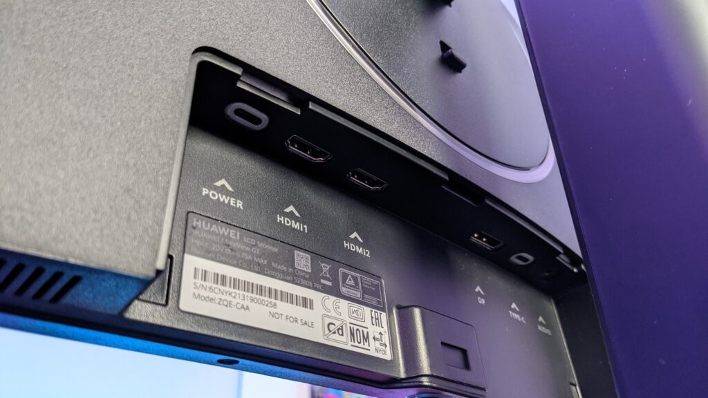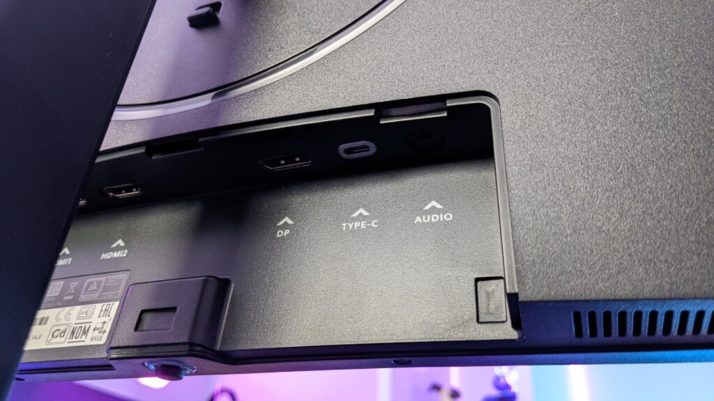 Around the back, you can find two HDMI 2.0 inputs and one DisplayPort. There’s also two USB Type-C inputs, one of which is for dedicated power, and the other is for video and finally a 3.5mm jack input for external audio sources. There’s a nice plastic vanity plate that hides the inputs but does nothing really for cable management once the cables have left the monitor.