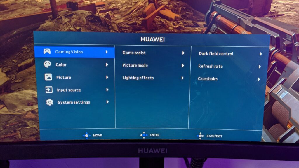 There are a few features inside of the OSD too when you dive into the menus which include Dark Field Control which brightens dark areas inside of games to see people hiding in the shadows, as well as a crosshair you can put on the centre of the screen. Huawei has offered an Overdrive setting in the menu, which combats blurring in motion, which does help somewhat, though if you go all the way up to level 4, things start looking a bit artificial, and if you go down to zero, then you can start to notice blur in faster-paced titles… Doom Eternal, I’m looking at you bro. It’s not as refined as other monitors and that could come down to the fact it’s playing with a 4ms response time, as opposed to the 1ms response times other gaming monitors are able to hit. Single-player third-person titles though like Red Dead or Horizon: Zero Dawn looked great and I couldn’t fault this monitor, or racing games like Forza or something like Flight Sim. They looked awesome! Other menu features include Colour changes for your brightness, contrast, temperature and a low blue light feature and sound which you know, changes the audio of the speaker in the monitor.