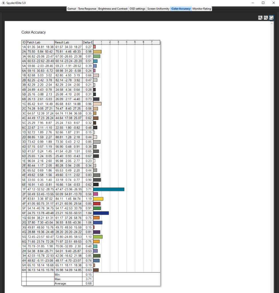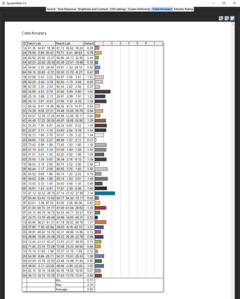 I ran a colour accuracy test twice. The first was before any kind of calibration, and the second was just after my colour calibration exercise and the results I thought were actually pretty decent. When running the test pre-calibration, the monitor gave me an average Delta-E score of 0.68 with a high of 3.17 and a low of 0.15. Once I ran a colour calibration, it didn’t improve the overall colour accuracy by a huge amount, as I must say it was already decent from the box, but I did squeeze a smaller average Delta-E of 0.94 with a high of 2.34 and a low of 0.17 so cracking score on the colour accuracy chart right there.