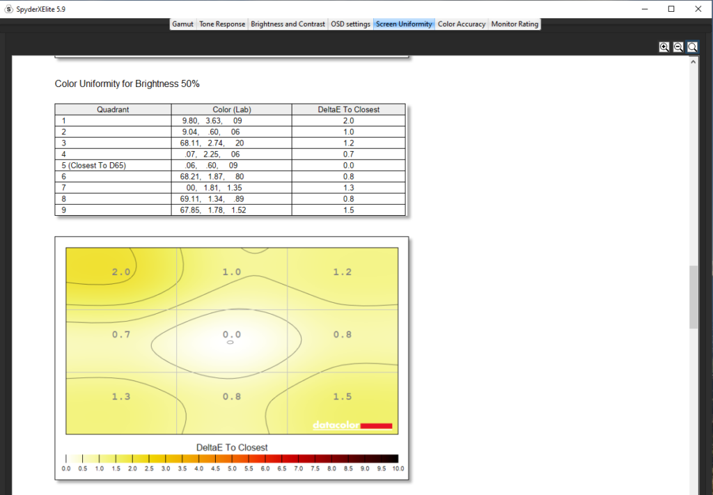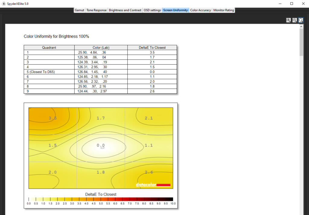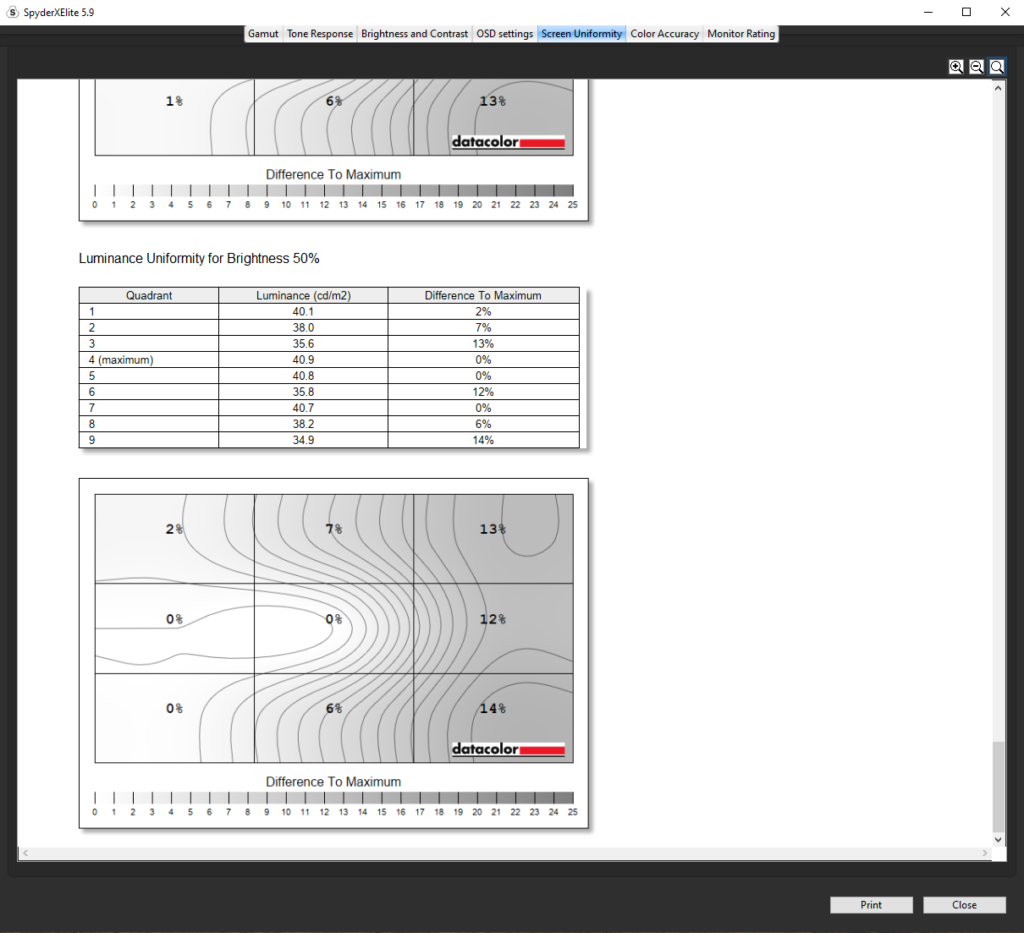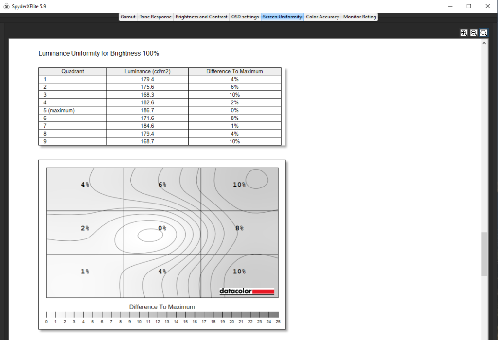 And moving on to the panel’s luminance uniformity, this again was pretty decent and the only real standouts were down the right-hand side where the luminance difference at 100% overall brightness hit 10%, but again, nothing major to really complain about, and it certainly didn’t affect my gaming or even watching media. When dropping the brightness to 50% though, the luminance uniformity did get worse, but again not by much at 13%.
