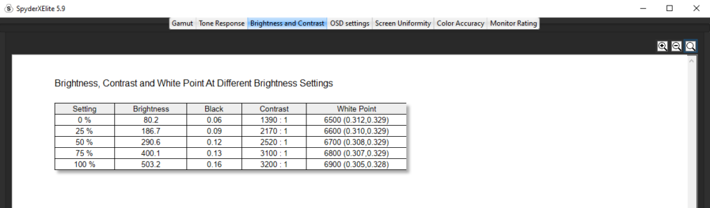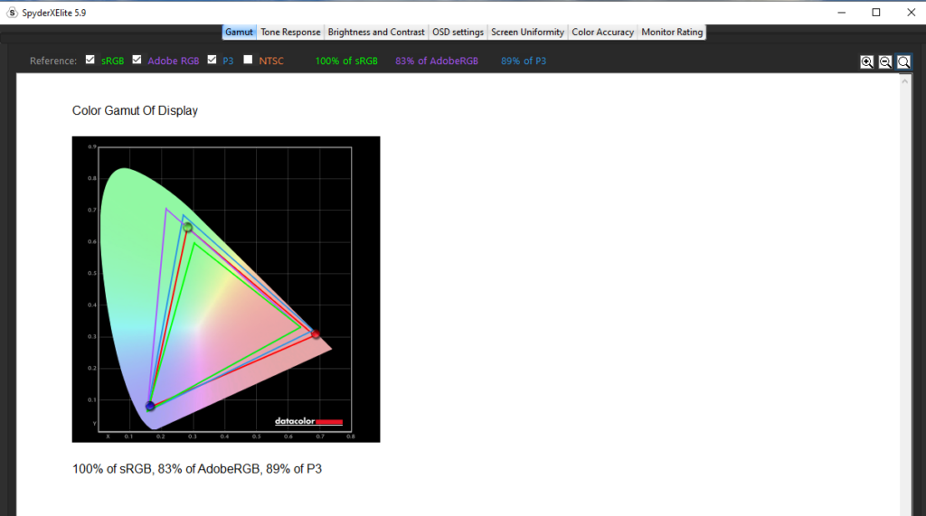 Running some tests using my Datacolor Spyder Elite, I started with the iiyama panel’s colour gamut. I can safely say that it’ll do a pretty decent job with gaming, but for content creators and colourists, please look elsewhere. This after all is technically a gaming panel, and with a score of 100% on the sRGB, your games are going to look decent. Though with scores of 83% AdobeRGB and 89% P3, you’re going to want to look elsewhere.