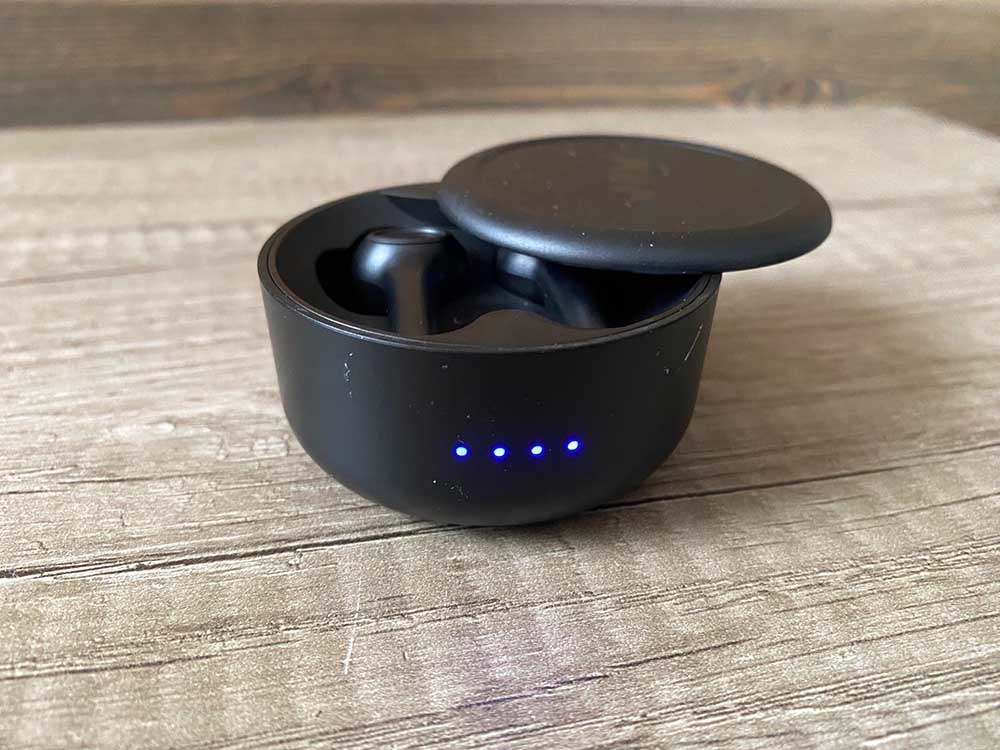 This is your typical wireless earbud arrangement and charging carry case. The carry case is very small, lightweight and it’s circular, which is unlike any other case I’ve seen before. The case has four small indicator lights to the front, showing battery level and they illuminate when you open the case. Another unique feature, you spin the circular top round to gain access to the earbud. It’s a nice idea, not one I’ve seen before but the lid is a little flimsy, with potential to snap with force, so watch that. The case has a micro USB port for charging, old school.