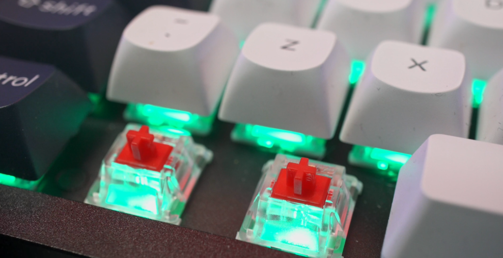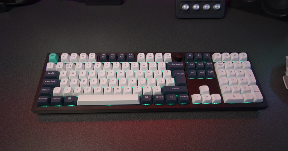 It’s the Keychron Q6 Max and this thing just screams quality productivity. I mean by default it came with Mac keys on there and I had to change them out for Windows keys which you do get in the box spare by the way. Of course though on the Q6 website, you can do some pretty lavish customisations like choosing between top of side-printed keycaps, which colourway you want and I must say that I do prefer the black, navy and white colourway over the white. It looks sleeker, and yes I know I’ve got a white setup here, but I think having the majority of the keyboard in white makes it look okay. The RGB effects help with making this keyboard look nice though unfortunately on the top printed keys you don’t get a shine through effect like you can see with mine here. You can also choose which Gateron Juniper switches you want out of red, banana and browns. I have personally got reds in mine and they sound like this.