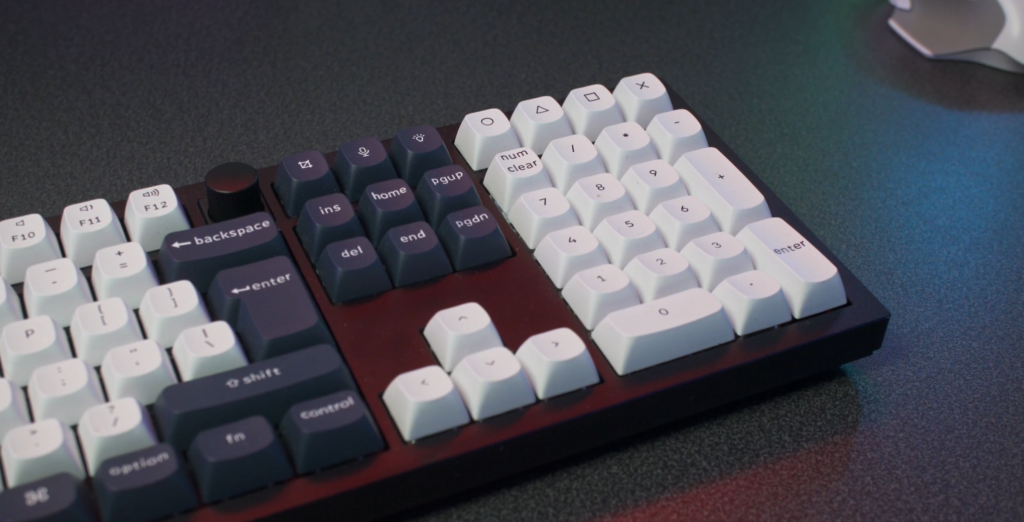 The layers of acoustic foam are pretty impressive too, as Keychron had added IPXE, PET and Latex to dampen the sound profile of this keyboard. However, it does still sound a little clicky for my personal taste though it’s more like a muted clack rather than a tinny clack Unsure if I’m actually making sense here. It doesn’t sound bad by any stretch, but I must say I’ve heard better in a keyboard. Well, more thockier anyway. Having a double gasket design gives the Q6 a decent level of bounce, without feeling like the keyboard is too squishy. This essentially means that it’s got two layers of gaskets inside. The first is between the plates, and the second is between the plates and the case itself. It’s strange because it takes little effort to type on this thing and it feels really nice, though I wish the spacebar was a bit heavier and sitting more solid in place. It’s a bit rattly as it stands. You could mod the keyboard to achieve this type of feeling if you wanted or as everything is hotswappable including the switches for three and five-pin MX style switches, you could go this route. You’ve also got some extra function keys as well as a volume knob and mute switch across the top right hand side of the Q6, and four completely custom keys above the numberpad which resemble Playstation controller buttons. It’s a nice touch, and the printed font on they keyboard is nice and clear.