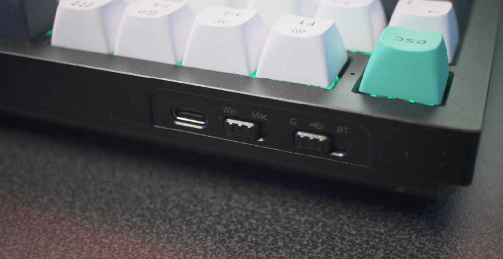 You’ve got three modes of connectivity too from your standard wired of which a decently lengthed USB Type-C cable is included in the box. It also connects to a 2.4GHz dongle which is supplied as well as being Bluetooth 5.1 compatible, though with the dongle you’ll get a 1,000Hz polling rate and with Bluetooth, this drops right down to 90Hz. It’s more than enough for a wireless keyboard for productivity on your desk as you’re not exactly going to be carrying this thing around with you anyway, though if you did want to game on this thing then I’d opt to use the dongle. It can also connect up to three devices simultaneously too if you’ve got a couple of devices on the desk. There are also some toggle switches around the back to set which keyboard type you’re using being Mac or Windows, and also which connection type too.