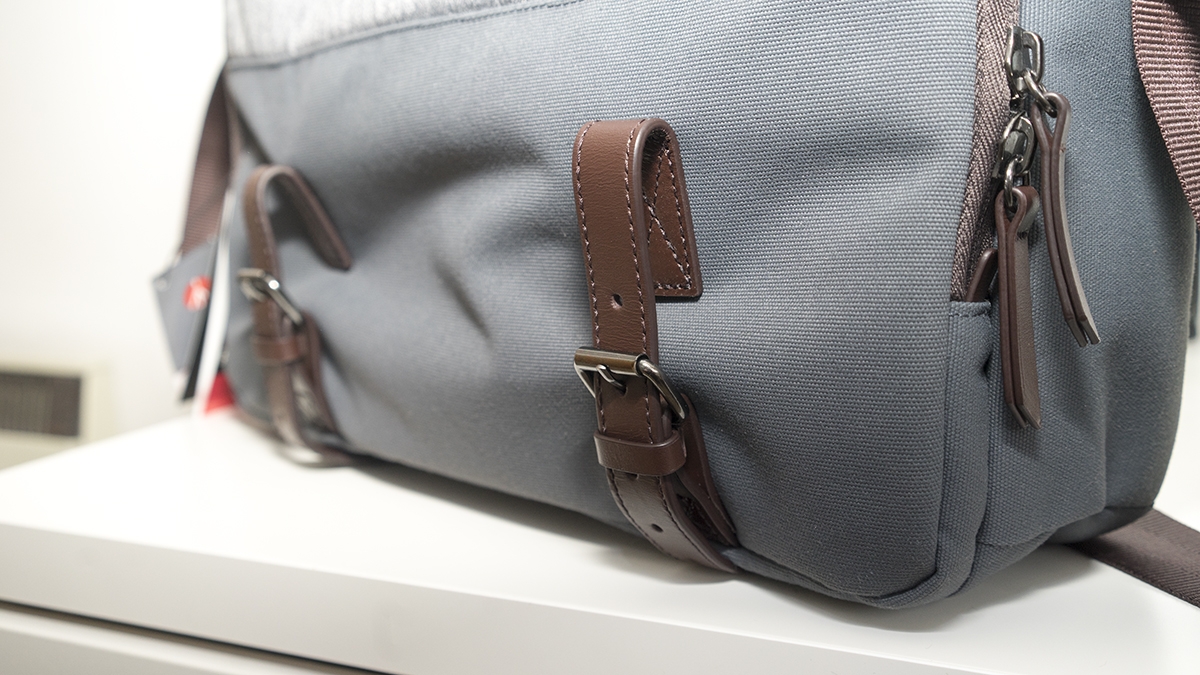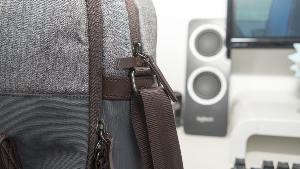So taking a look at the outside of the bag, it looks very business like, with a denim type grey wash material on top, coupled with a darker, more synthetic material on the bottom. The seams are all protected with a leather rim so the bag doesn’t suffer from bangs and knocks as you walk through a crowded area.