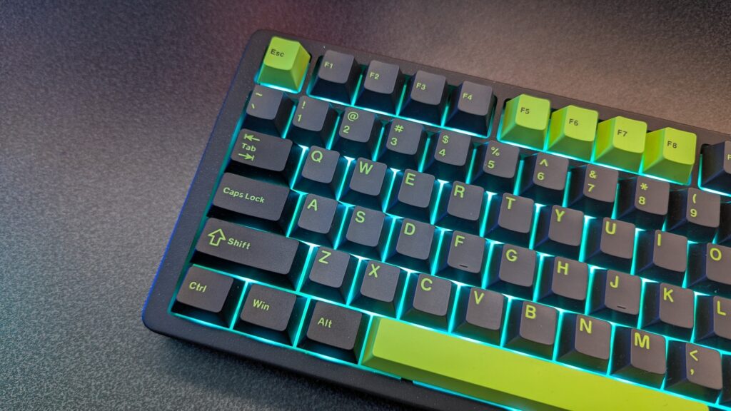 However, if this noise profile really isn’t for you, there is the chance to change it as the board is completely hotswappable so you can go mad with your own switches, without the need to do any kind of soldering. Even though the keycaps are double-shot PBT, unfortunately they’re not shine-through keycaps as standard, and I must say I do miss it, especially when gaming in a darker environment and I need to quickly glance at my keyboard. Yes, unfortunately, I’m one of those gamers. It has got south-facing RGB backlighting which is nice and subtle. I’ve still got it on the default static teal colour it came with and it actually looks quite nice with the green keycaps the Blade 75 came with, though there are a number of effects you can choose from.