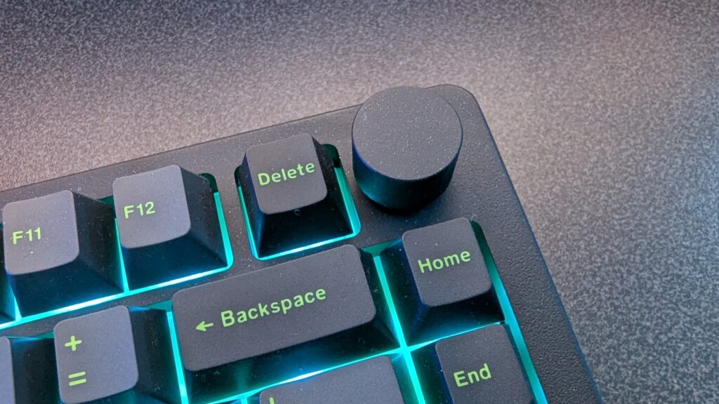 Being made from a slab of aluminium it does make this keyboard pretty heavy which can get a little annoying if you’re someone who likes to shuffle their keyboards around the desk. But it also does mean that if you’ve found a position you’re comfortable with, it’s not going anywhere. There’s 81 keys which equates to a 75% layout which will definitely be good enough for most people. Basically means no numberpad but still retaining your function keys down the right hand side. The Delete key is in a bit of an annoying place next to the rotary knob in the corner, and I must say I hit the Home key more times than I’d like to admit thinking it’s the Delete key but that’s something I’ve got to get used to.