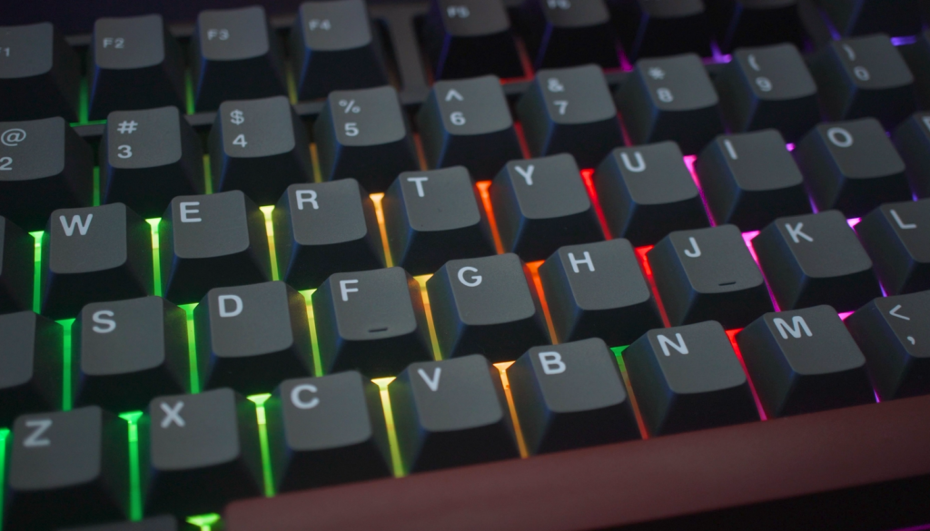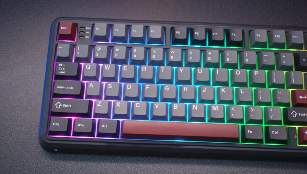 It uses Cherry Profile Double-shot PBT keycaps which look nice and the font looks nice and clean. However, there is no RGG shine through unfortunately making a little harder to see in less than ideal lighting conditions. I haven’t got the best eyesight in the world and I struggled to see the letters under the glow of my monitor screen. It’s a 79 key, 75% compact layout keyboard with a few important function keys down the right hand side and no numberpad, though there is a larger version available that includes the numberpad if that’s what you need.