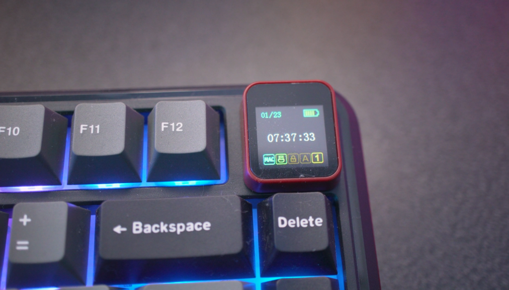 A big selling point of this keyboard is the interchangeable screen on the top right-hand side of the keyboard. By default the screen shows the time, battery status as its a wireless keyboard, its connection status and also whether CAPS lock is on or not. This can be switched out for a control knob if that suits your needs more which controls your system’s volume. Personally, the screen looks way cooler and far more useful, and you can even customise it to show off GIFs.