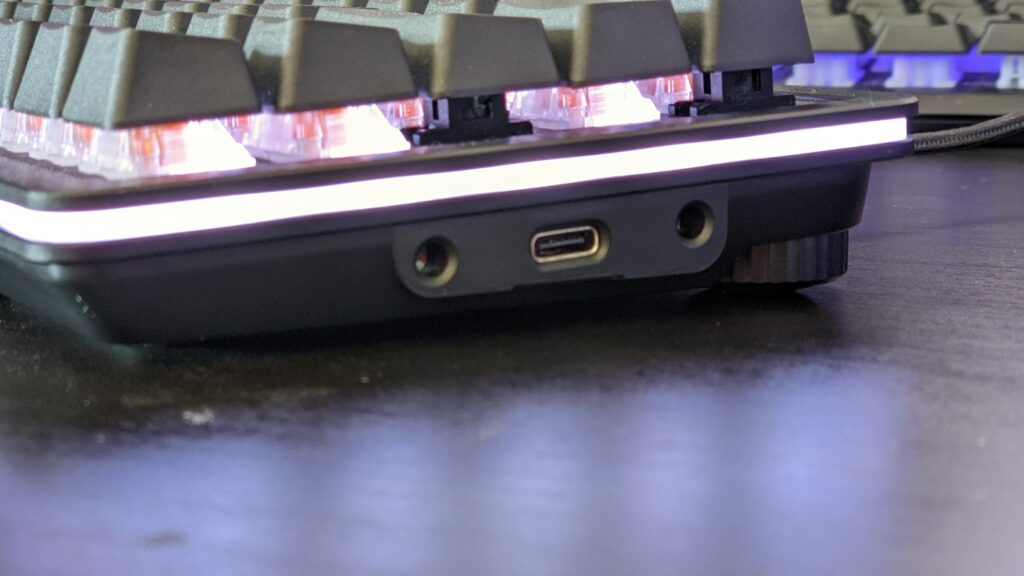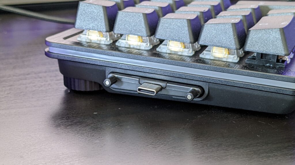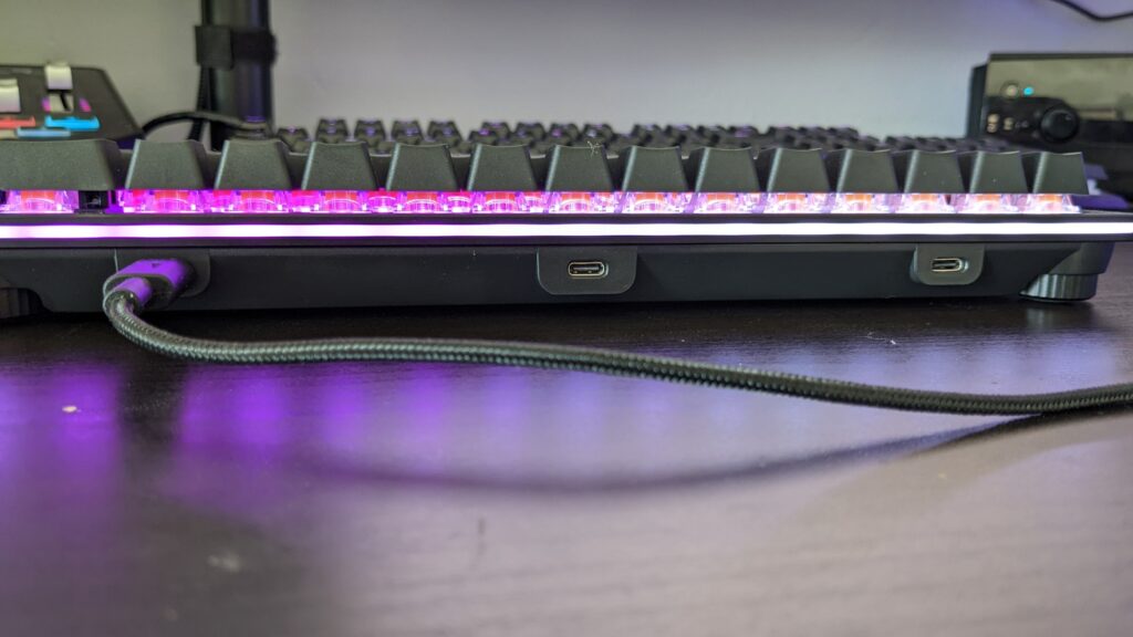 I mentioned earlier a number pad. This is also a fully modular piece of kit that you can choose as an add-on either when you purchase the keyboard, or at a later date. The great thing about the additional keypad is the fact it can sit on either side of the keyboard. There’s a switch on the underside of the keypad that you can flick left and right to extend the connection. If you’re a bit more of a traditionalist, you might opt for the keys to be on the right, like a traditional keyboard. But do remember, you’ve now effectively got the chance to have a set of hotkeys right next to where you’d usually place your hand for WASD. Again, placement is a personal preference for your playstyle, but it’s definitely a welcome feature. The Everest 60 uses a USB Type-C connection to connect to your PC, and there are three places this can go, being back left, middle or back right.