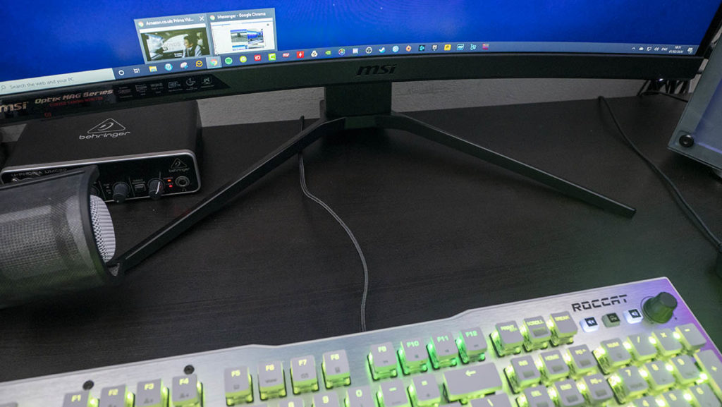 The monitor has a tilt adjustment between -5° ~ 20° and a height adjustment of 0 ~ 130mm. However, why MSI haven’t included a swivel is beyond me. But I suppose most people looking for a gaming monitor are going to be sitting in front of the screen anyway, so is it really needed? Probably not. The monitor sits on a chunky stand which feels very well built, and very ridged. It’s held in place by two screws on the back rather than the more standard clip you find on other monitors today. The pedistal stand has a cable hole to route your cables down the rear, keeping things looking neat. And the legs themselves take up very little real estate on your desk.