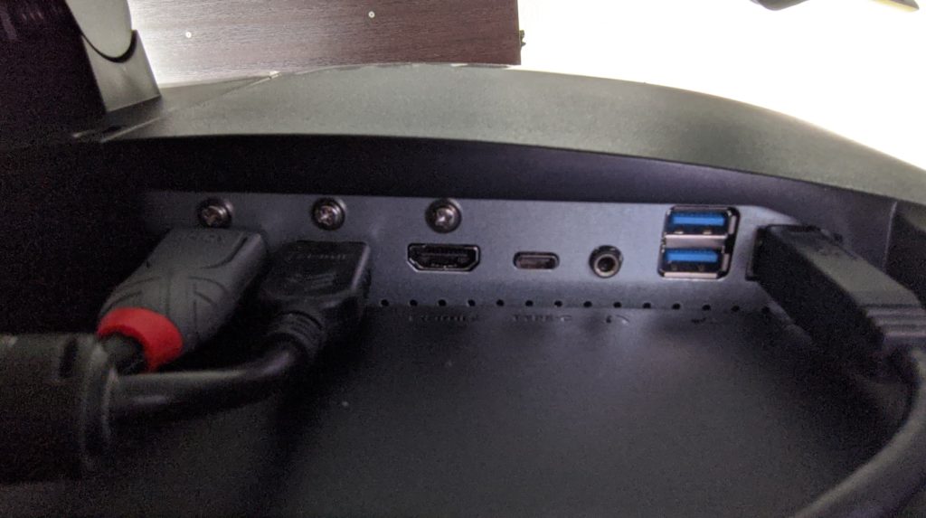 While we’re round the back, we may as well talk about the ports. You can find one single DisplayPort 1.2a, two HDMI 2.0b. There’s also three USB ports – two USB 2.0 and a single Type-B to connect to your desktop to activate the 2.0 USB ports. There’s also a 3.5mm aux out for headphones.