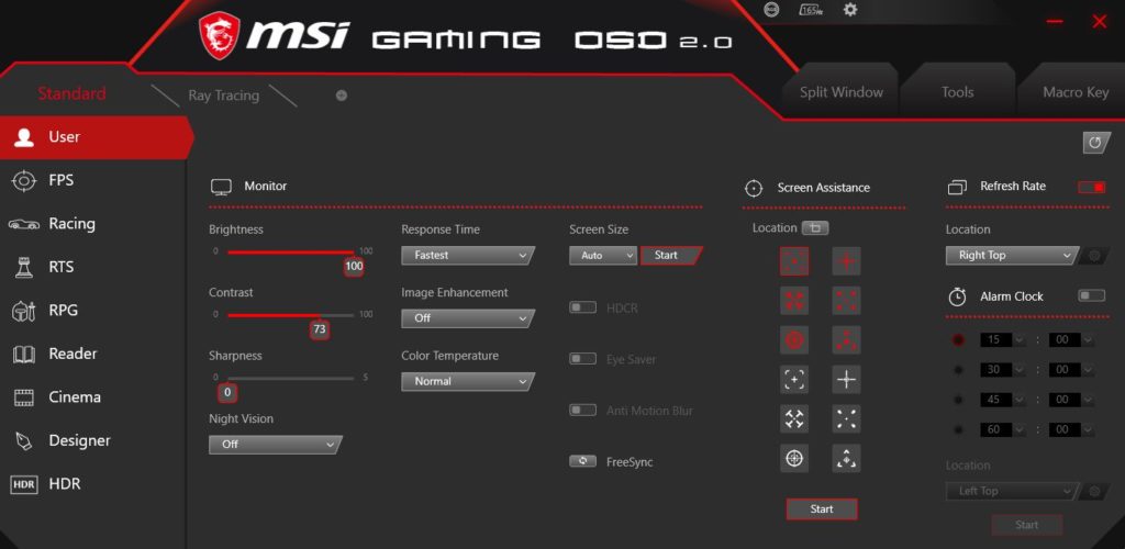 Running our MSI MAG272CQR through our Datacolour Spyder X showed some interesting results. While MSI claim that colour contrast comes in at 3000:1, in reality, this was closer to 2000:1. While colour accuracy after a calibration showed us a Delta-E average score of 1.06, which is significantly better than what we were given out of the box, which is odd. There was a huge noticable difference. The image uncalibrated had a purple hue to it, while after calibration, this was significantly reduced by adding a green tone. There are settings inside the menu for individual RGB sliders to attempt to reduce this though under the custom colour temperature preset if you don’t have access to colour calibration tools. Colour Uniformity for a 100% brightness was also exceptional and finally, the monitor will cover 100% of the sRGB gamut, but falls short of under 90% on AdobeRGB and a 90% DCI-P3 colour gamuts. Running the calibration also destroyed the brightness of the monitor image, but that’s what it needed to doto get a more natural colour. All settings can be seen in the gallery below.