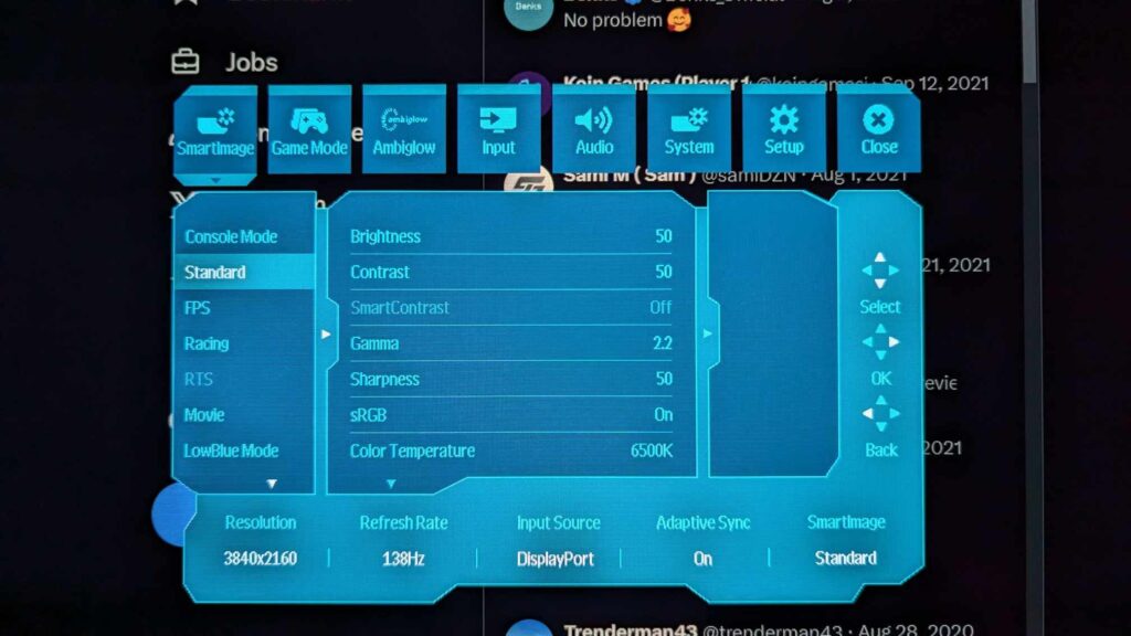 The Philips Evnia screen here is a 42-inch 4K OLED panel that can pack a punch when it comes to gaming performance. Not only do you get the added benefits OLED gives when it comes to motion clarity and blurring, but you’ve also got a refresh rate of 138hz. Why not the standard 144Hz like other gaming panels produce I’m not sure, but it’s still pretty decent when it comes to motion blur performance. Philips has also treated users to full-bandwidth HDMI 2.1 so you console gamers out there can fully experience this screen at 120Hz. And what more, you can actually lock the HDMI ports individually to 120Hz too. Speaking of ports around the back you’ve also got your DisplayPort, a USB hub and also power. The screen itself has a matte finish with some kind of anti-glare film across the front which works quite nicely actually and did help wit the glare from my window somewhat. However to get the most out of this monitor, get as much light out of the room as possible just so those colours pop even more!