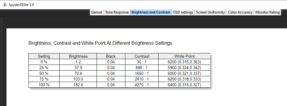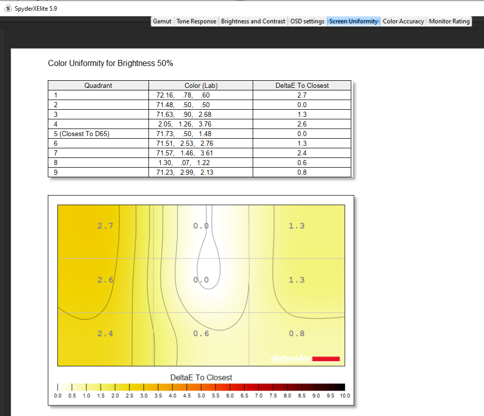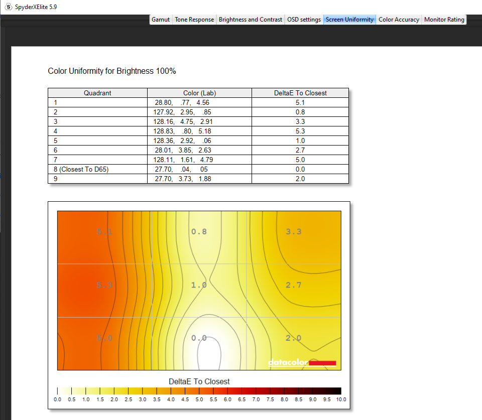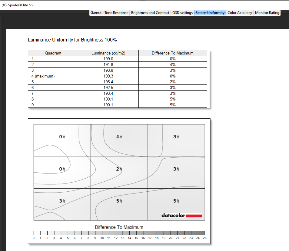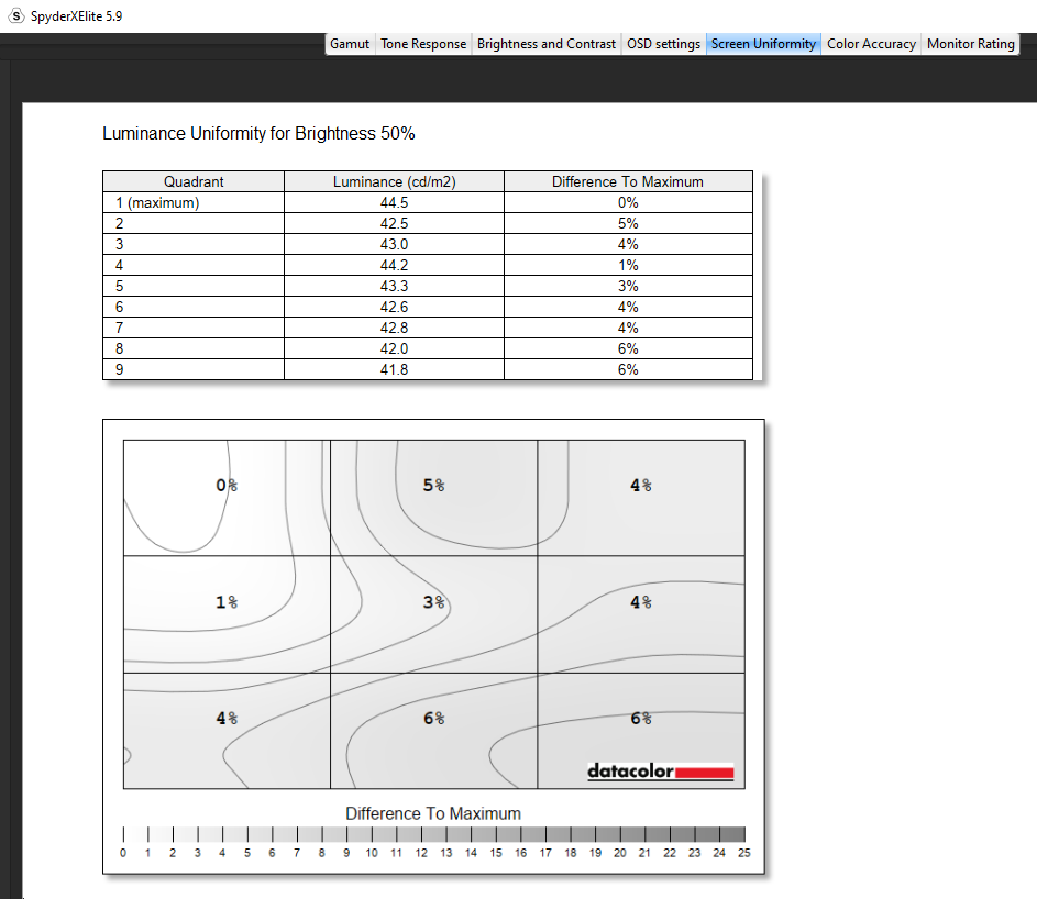 Looking at my gamuts, after a calibration I managed to get 100% of the sRGB colour gamut, but it did fall down on AdobeRGB coming in at 89%, PE fared better at 95% and NTSC came in at 87%. So somewhat varied there. Brightness and contrast were superb, with SD mode at 100% brightness coming in at 182.6 nits of brightness with a contrast ratio of 4,270:1 which was marvellous to see and a white point of 6,400. Colour uniformity at 100% brightness saw some hot spot issues all the way down the left hand side, while at 50% brightness, things looked a lot more even across the panel and luminance uniformity at 100% brightness was fine, no issues there.