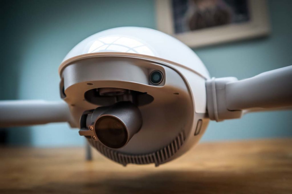 The camera part itself is egg shape, it’s glossy white and has a plastic casing. Remove the plastic cover on the underside and things begin to take shape. You will find the camera, on it’s gimbal to the front of the drone and also a variety of sensors to the underside. There is a single push button and four small lights to the top, which shows battery level and turns the device on. There are two small push buttons either side of the drone, push them in and then that top section where the button can be taken off. Below it is the battery, which easily pulls out, which then gives you access to the microSD card slot too. Either side of the battery is where you attach either the propeller arms, tripod mount or wrist strap. It’s very easy to attach them and they all clip in the same way.