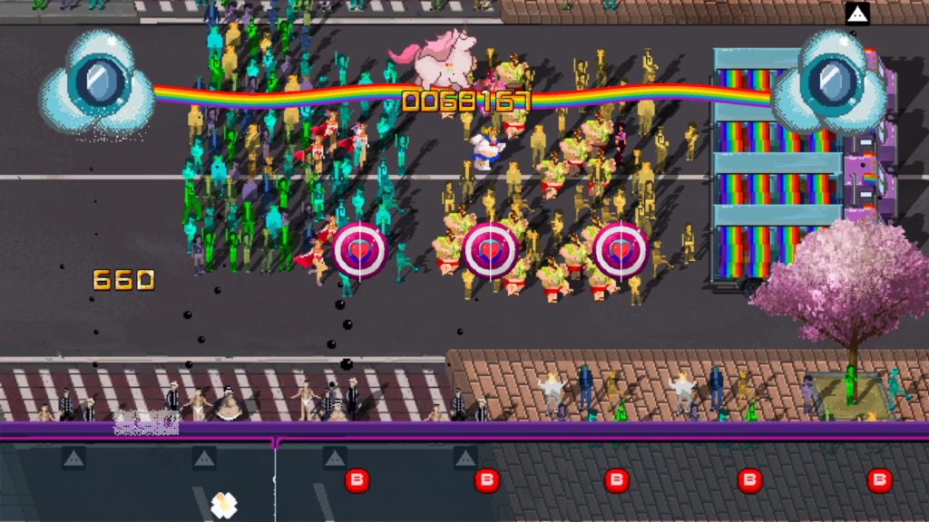 Pride Run at its core is a simple beat matching game, with a number of difficulties for all gamers of all ability. The objective is to protect the Pride Run parade from haters, like a Donald Trump-esque character that can be seen in the above image.