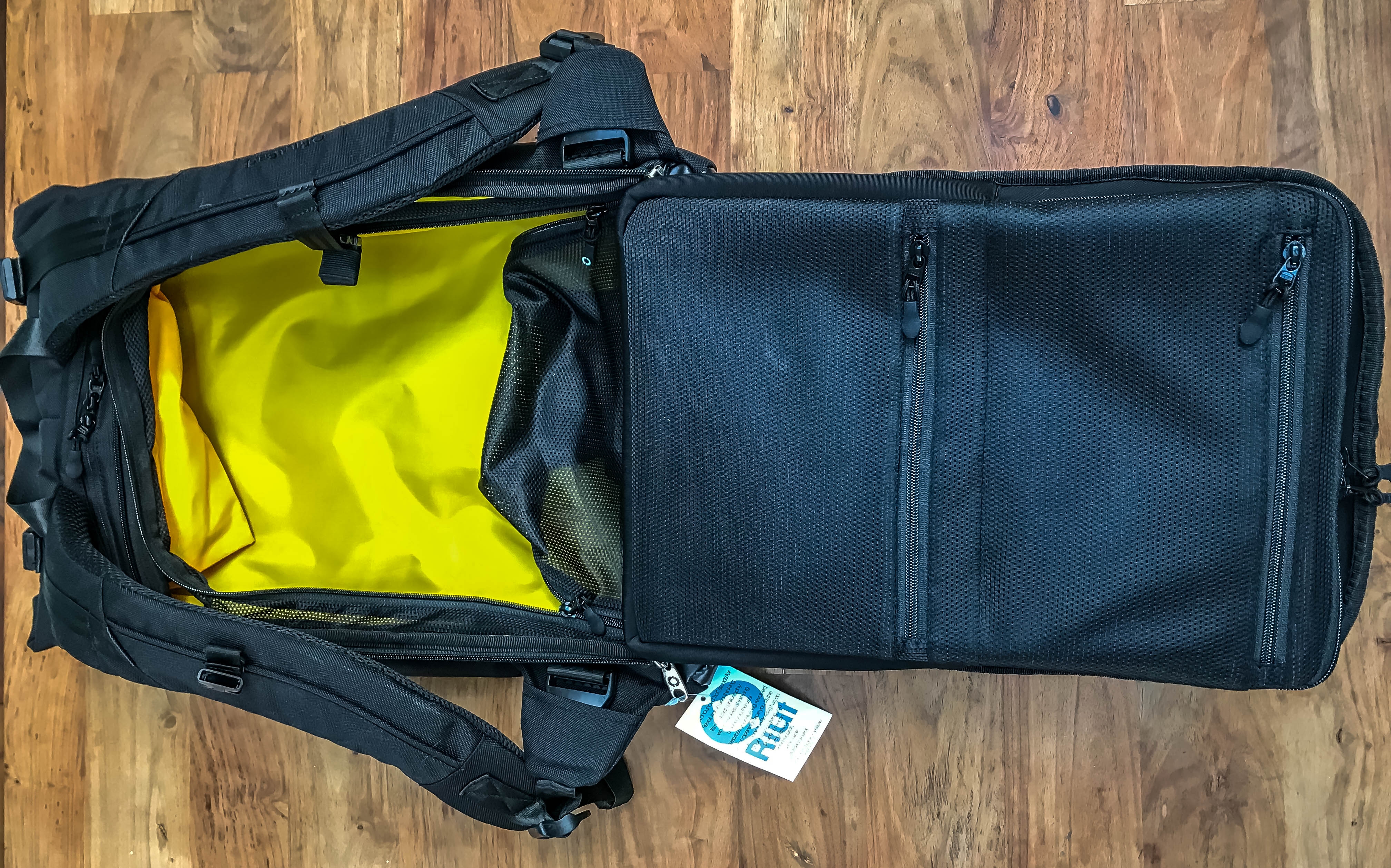 The X25 has had a bit of a make over, it’s still got the distinct RiutBag look, including the black fabric & bold logo on the front. To me, it looks a lot more subtle, with less curves & stitching, which I like. Number of pockets & locations are very similar, if not identical to the R25, which includes the main compartment & a lower back pocket & a high back pocket. The internal compartment is now finished with a vibrant yellow lining, which adds a bit of much needed colour to the bag. The bag is slightly smaller than its predecessor, but its only 5cm slimmer at the width. I was surprised to see that, as one of the first thoughts I had was “this seems smaller” and I guess that illusion is achieved with its newest feature…