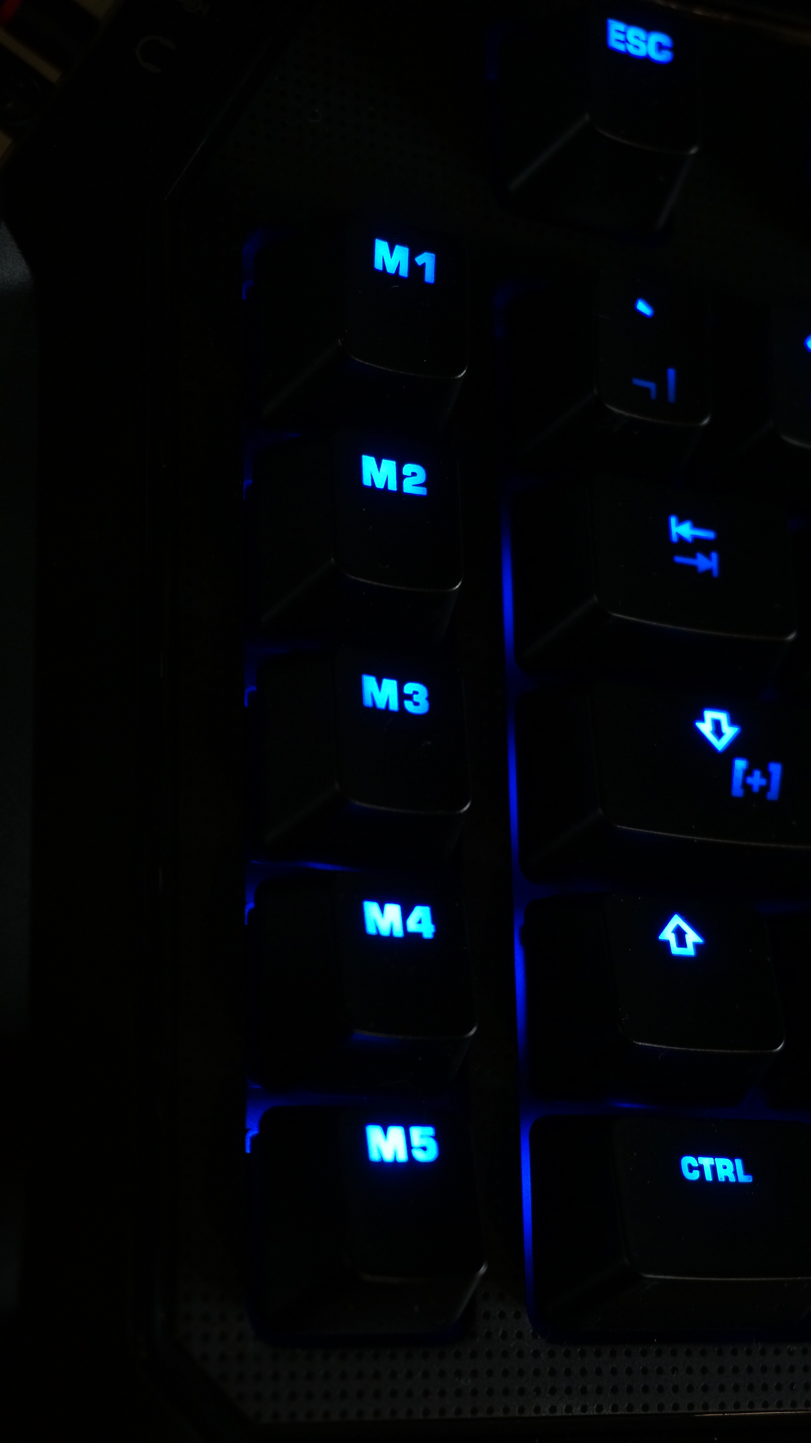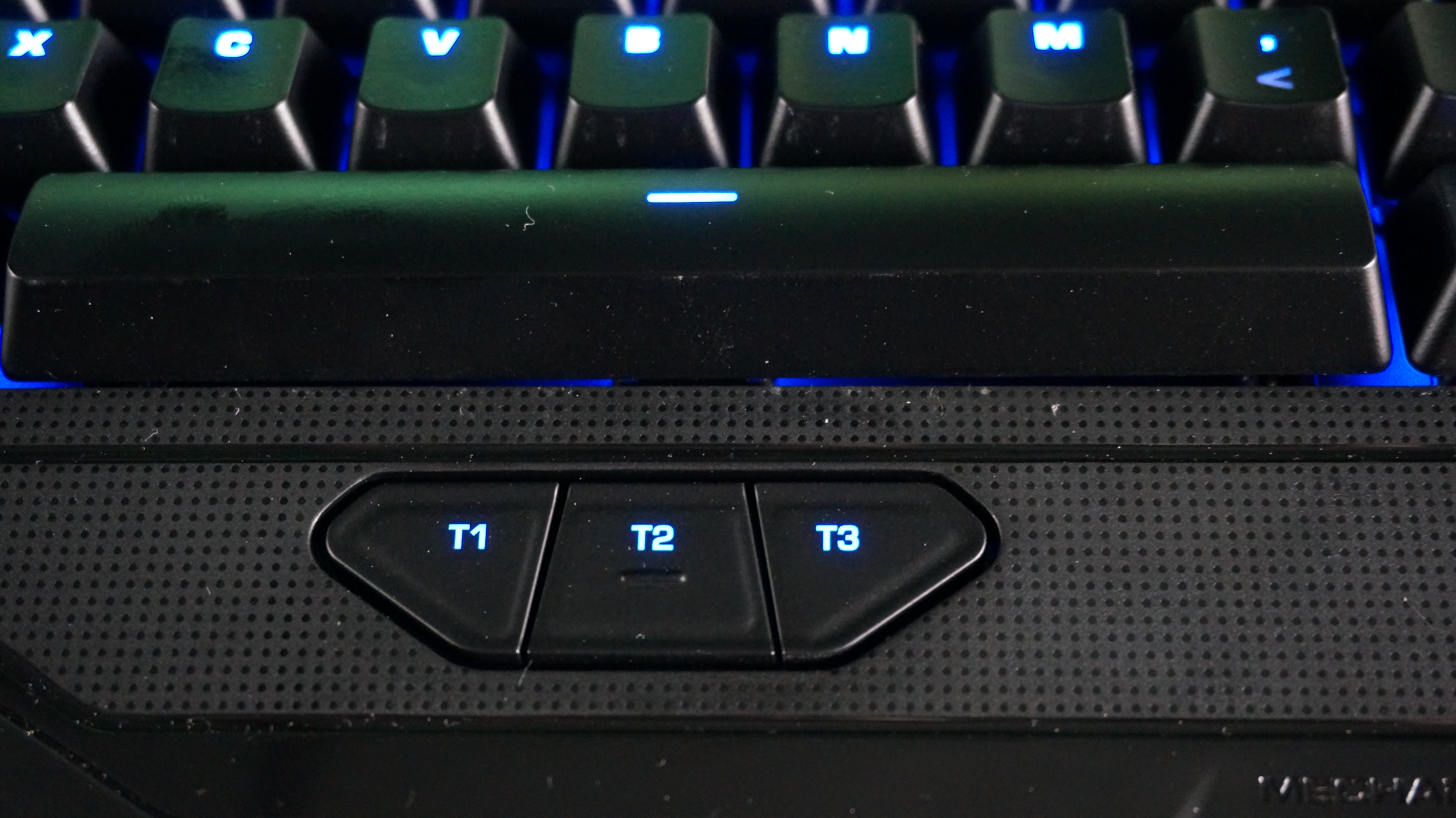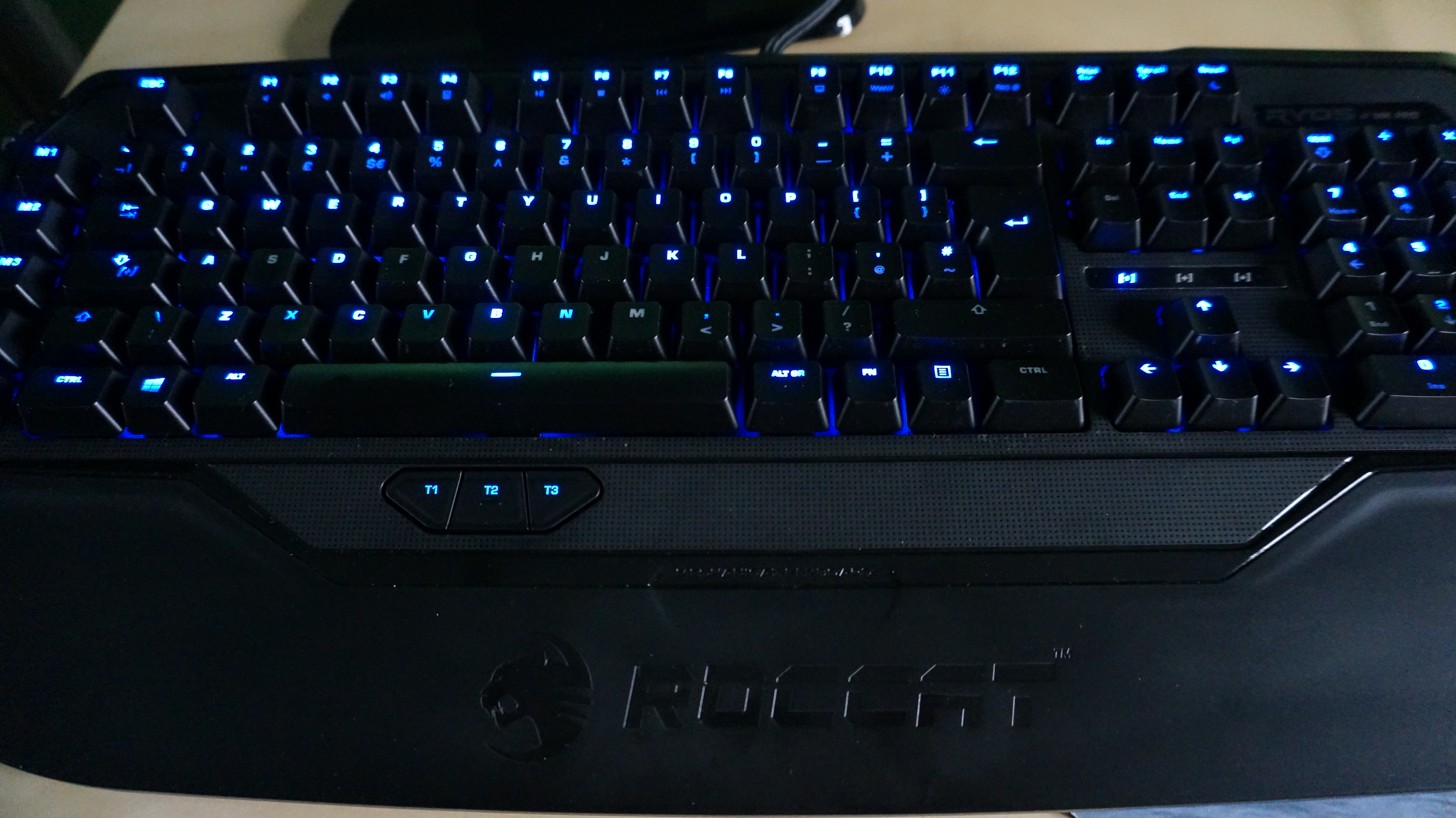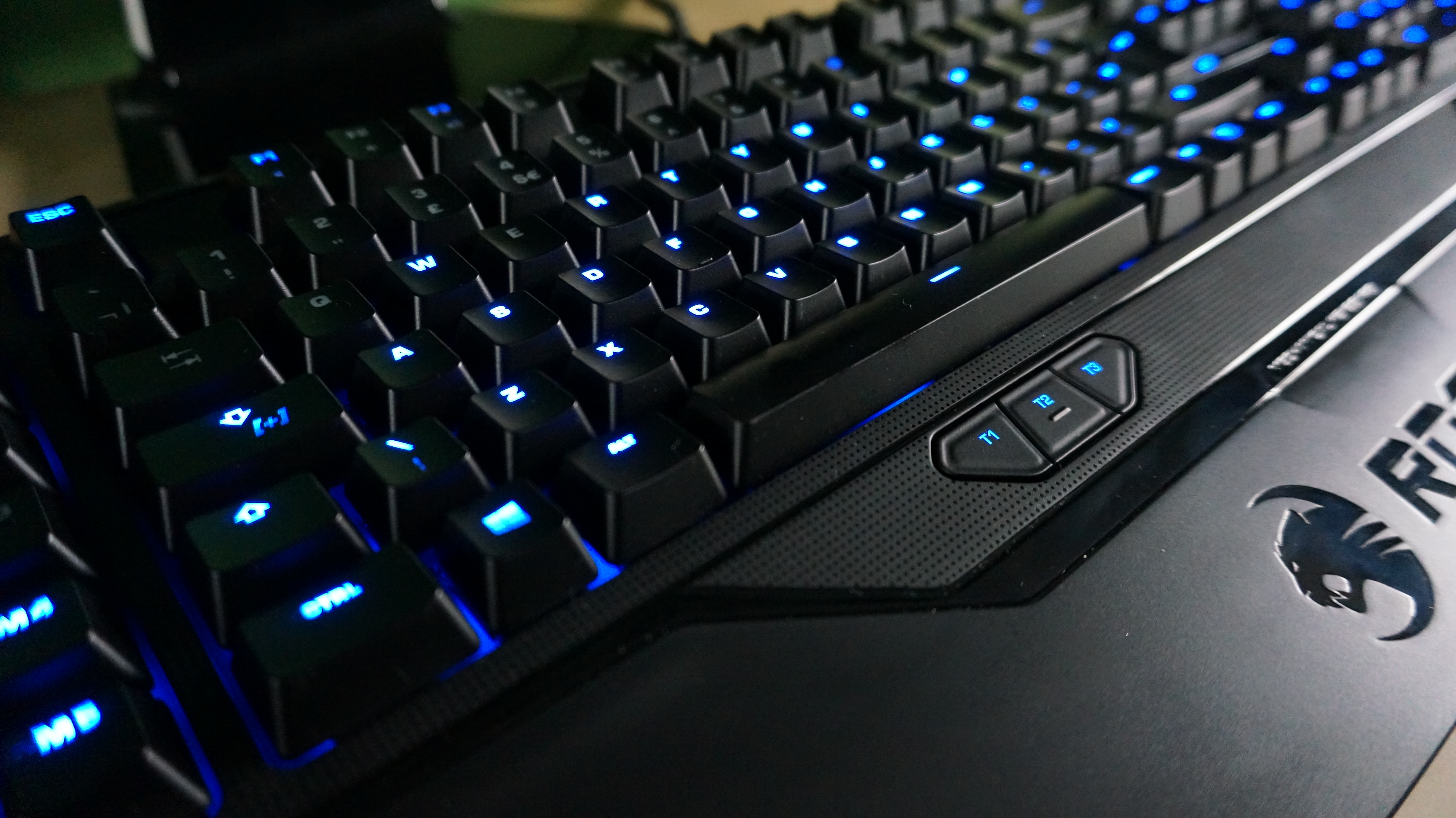 The macro key setup was designed with competitive gamers in mind. Looking at the keyboard you will see 5 dedicated macro keys down the side labelled M1 – M5 as well as three keys below the space bar labelled T1 – T3. These can be set up for either a one time action, or used in conjunction with another key on the keyboard to create a macro command. I found the gap between the keyboard and M keys a little too big, and had to really stretch my little finger over, especially with the likes of the M1 key. This probably comes down to the size of my hands and fingers. The T keys are brilliantly placed and takes no effort moving your thumb down to reach them. There are also profiles that you can set up. Using the Shift [+] key, you can literally change the command of any key. For example, if W is your run forward key, if you tap the Shift [+] key you can change your action to something like throw grenade. Letting go of the Shift [+] will return you to running. brilliant in MMO situations of having to fire off several spells at once.