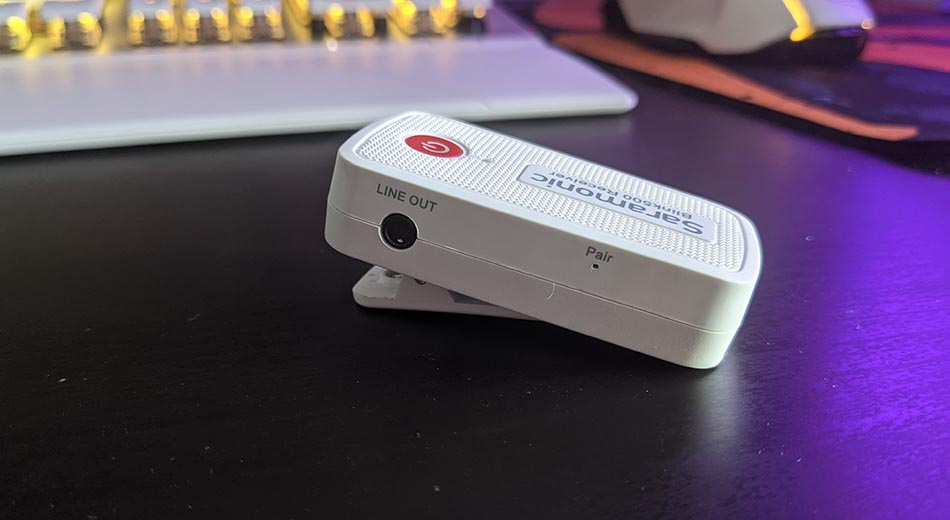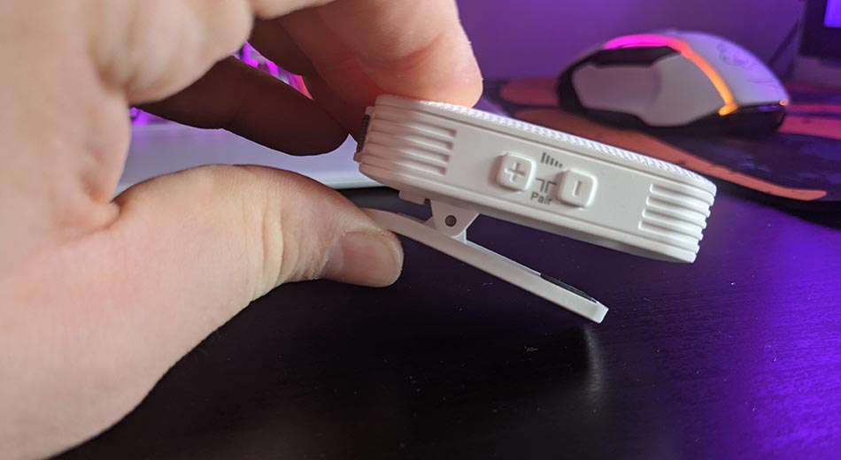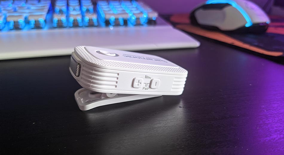 On each transmitter, there are a couple of buttons, which are for power, and the second is a toggle for microphone sensitivity. The sensitivity is indicated by the blue light. If the ring goes around the whole power button, the microphone is super sensitive. If it doesn’t then the sensitivity will be lower. The built-in microphone is placed on top of the transmitter, which has been designed to aim towards your mouth, and the clip on the back enables users to clip the transmitter to their clothing.