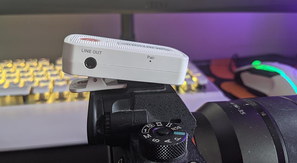 I will say now that it’s probably best to clip it sideways to a shirt, rather than the collar of a t-shirt. The reason being is the transmitter is a little heavy, and if you’ve got a slightly looser fitted tee, then the collar can sag a bit. If it’s clipped between buttons on your shirt, then you will be absolutely fine. On the receiver, the clip on the back of the device is wide enough to fit inside of the hotshoe on a DSLR camera, so it can be nice and secure. It means the hotshoe now can’t house a small screen or LED light if that’s your thing, but if you’re using a cage, then that shouldn’t matter too much.
