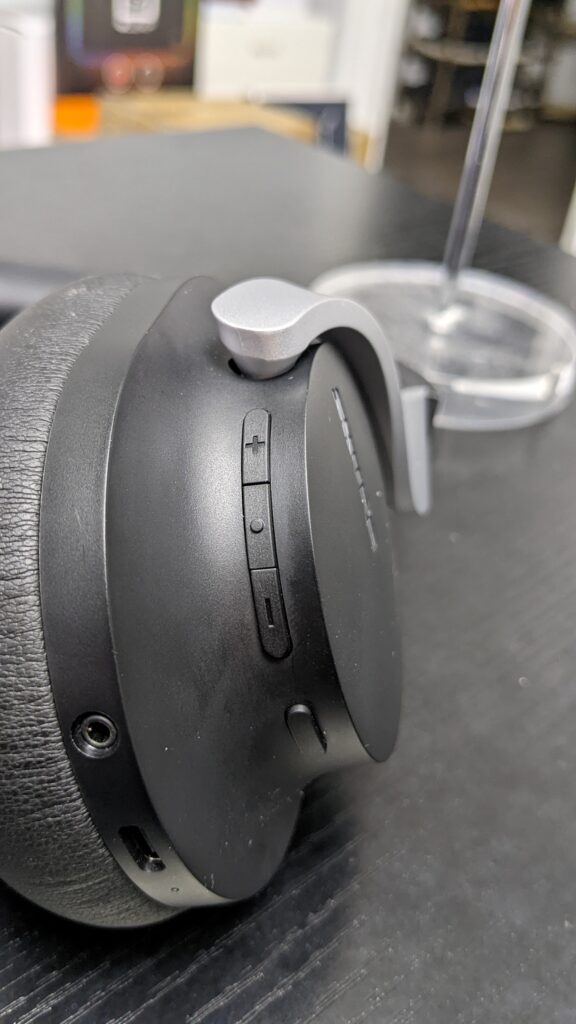 The left earcup is pretty much free from clutter, as it only houses the power and Bluetooth connect button, of which activates Bluetooth 5.0. On the right earcup though you can find buttons for play and pausing music, volume up and down and the button that switches between ambient and noise cancellation modes. I couldn’t find a skip track feature, no matter how many times I tried on my set here. Multiple presses just turned my music up and down.