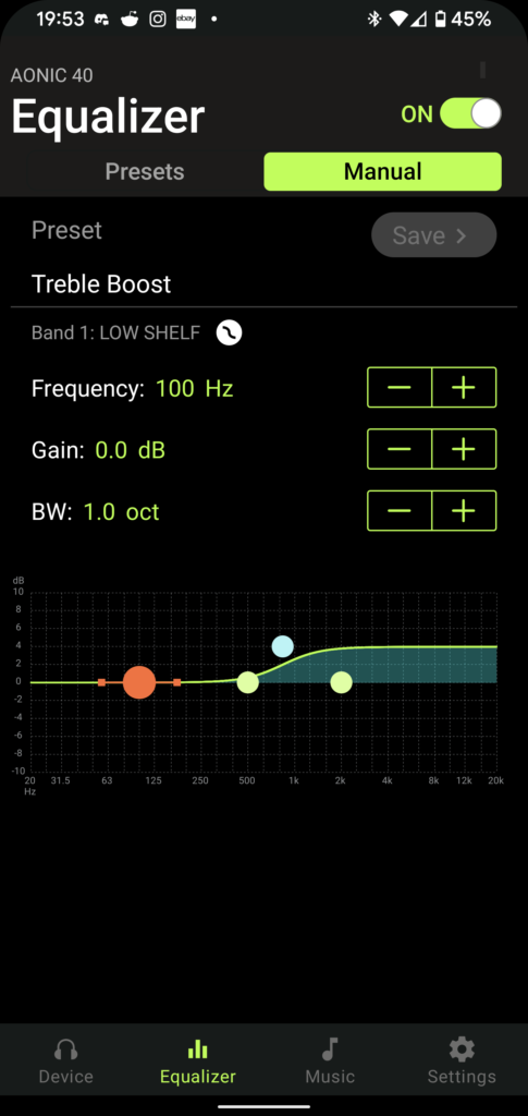 The standout feature on ShurePlay though is definitely the EQ, where you can set your audio quality using presets like a bass-cut, treble-cut, a boost to the vocals and so on, but you’ve also got a really in-depth custom EQ you can switch on that allows you adjust your gain, bandwidth, and frequency. To be perfectly honest with you, I don’t know what all of those do, and it took me a bit of experimenting to really find a sound I was pleased with, but the layout and how easy the app looks and performs is amazing for people with the lack of knowledge to hone in on their preferences right from the word go. Once you’ve found a manual EQ setting you like, you can save it as a preset inside of the app to return to at a later time. So you can really mix and match it with the genre of music you’re listening to.