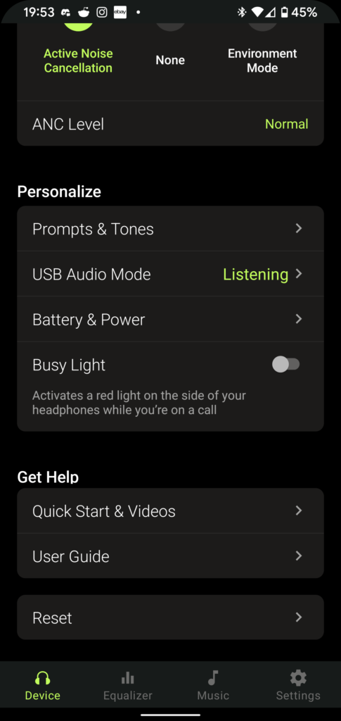 However, most of this stuff can be controlled inside of the partner app – ShurePlay. ShurePlay I must say is one of the best-implemented apps I’ve seen for a while for Bluetooth headphone offerings. There’s so much to this app that’s completely customisable that you can really dial your settings in. After all, this is what Shure is really going for with their studio accurate sound quality. The device page, as well as showing you your battery level of which you have around 24 hours and firmware updates, allows you to adjust the levels of the noise cancellation and environmental modes, aka ambient sound through a fader. For active noise cancelling I settled on low, as the medium and high setting introduced a faint hiss to my ears. It’s not off-putting by any means, but it can be noticeable during quieter audio. The environmental mode or ambient sound I kept whacked right up to the top in case someone needed to get my attention in the office.